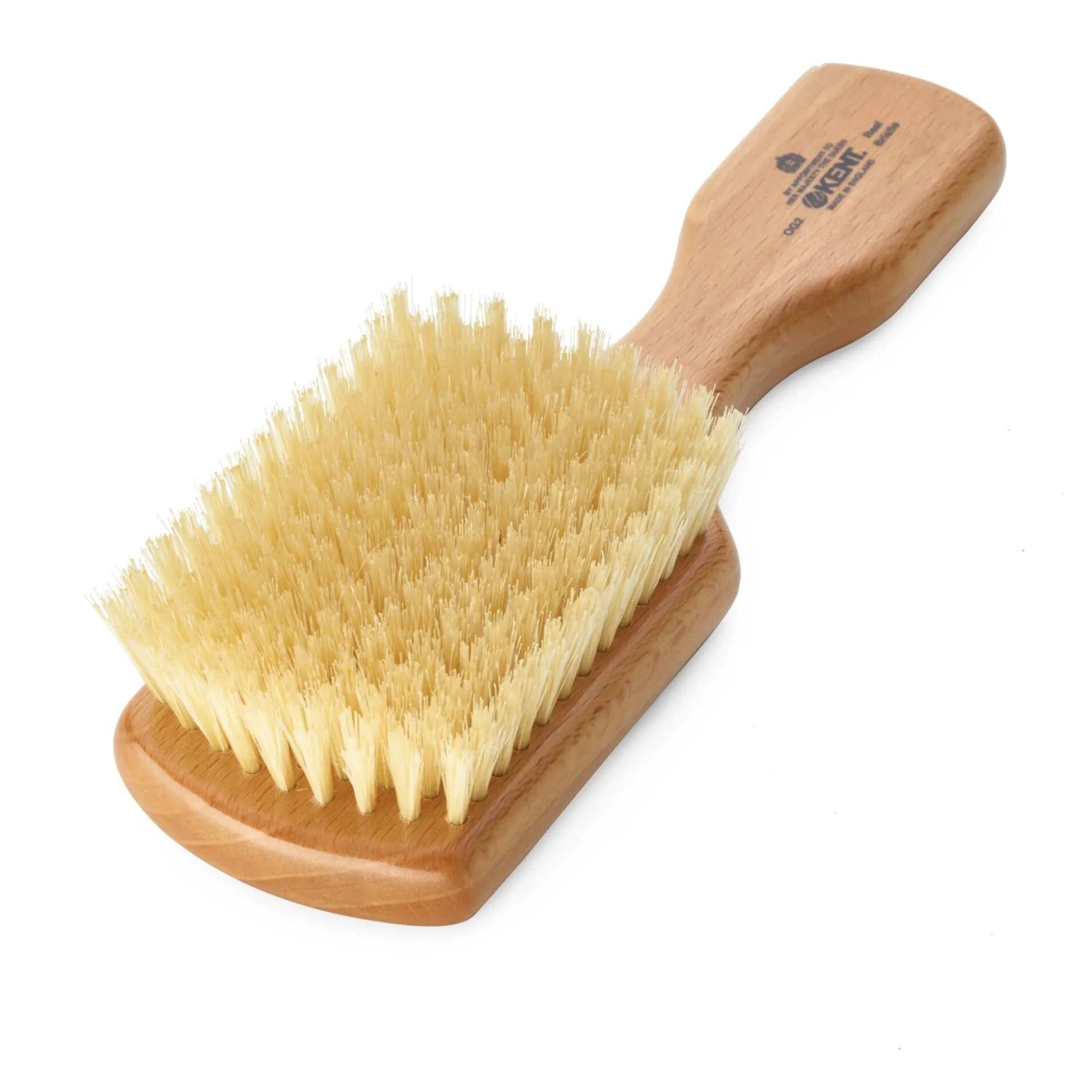 Eine gute Haarbürste glättet und entwirrt das Haar auf schonende Weise, dabei verteilt sie gleichzeitig das natürliche Fett, das sich an der Haarwurzel sammelt, bis in die Haarspitzen. Dies macht das Haar glänzend und sorgt dafür, dass sich die Haarspitzen nicht so schnell spalten. Wirklich effizient geschieht dies nur mit Naturborsten, die dem Haar in ihrer Struktur ähnlich sind. Mit einem Besatz aus solchen Naturborsten fertigt Kent & Sons bis heute einen Großteil seiner Haarbürsten – nach wie vor in Handarbeit, wobei auch die Borsten mittels Handeinzug eingebracht werden.
