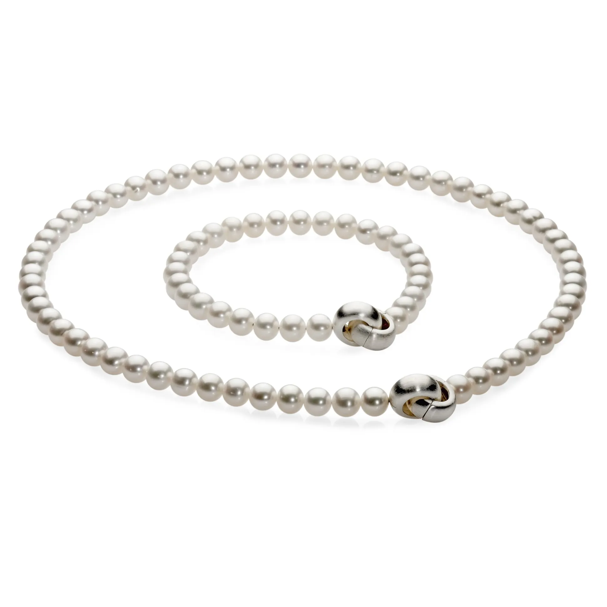 Süßwasser-Zuchtperlen, Ø 6,5–7 mm. Schließe aus zwei massiven, mattierten Silberringen (925er Silber). Collierlänge 42 cm. Gewicht ca. 27 g.