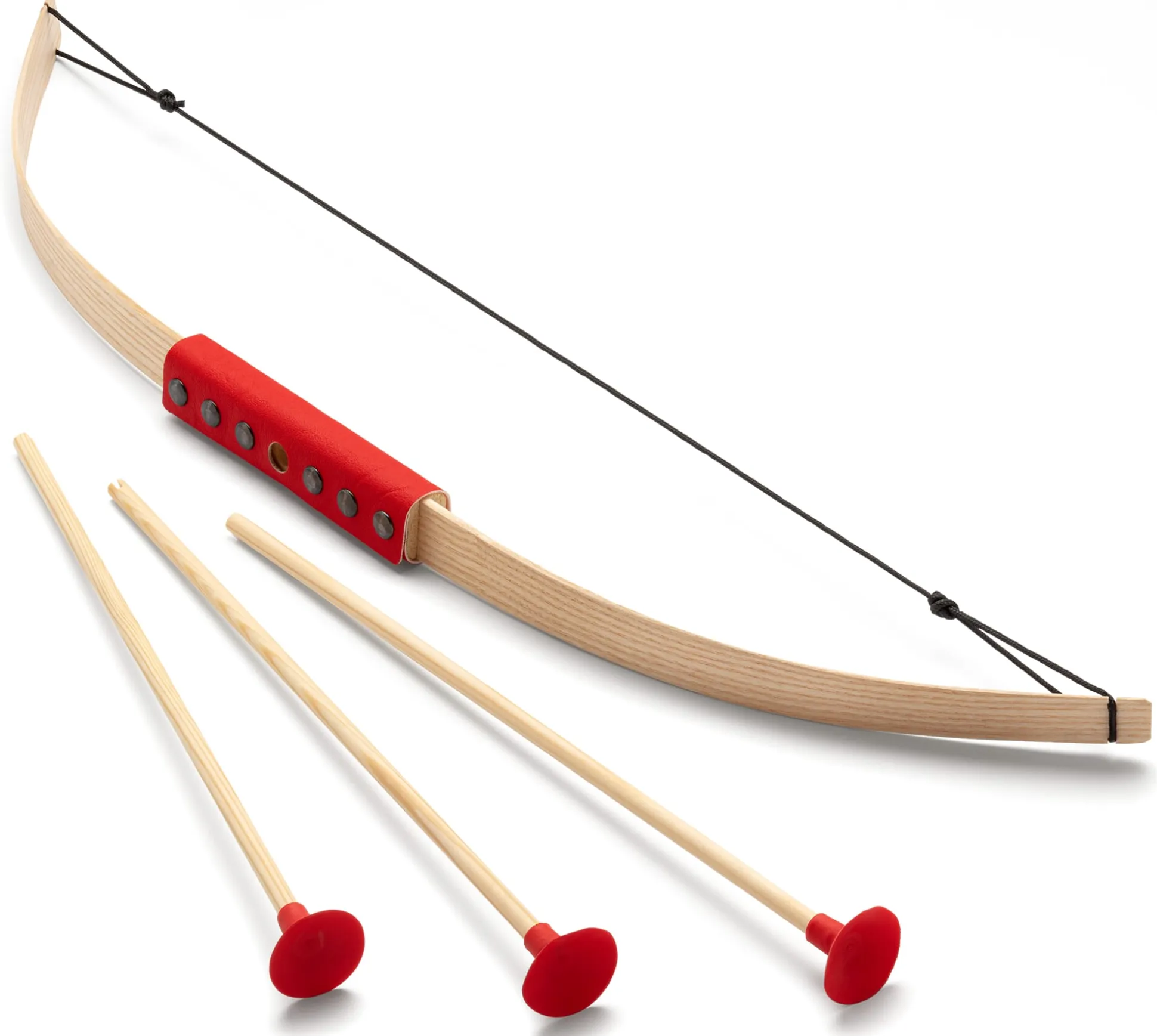 Bogen aus Eschenholz mit Griff aus Kunstleder. 3 Pfeile aus Eschenholz mit Saugnäpfen aus Gummi. Länge Bogen 65 cm, Pfeile jeweils 34 cm. Gesamtgewicht 100 g.