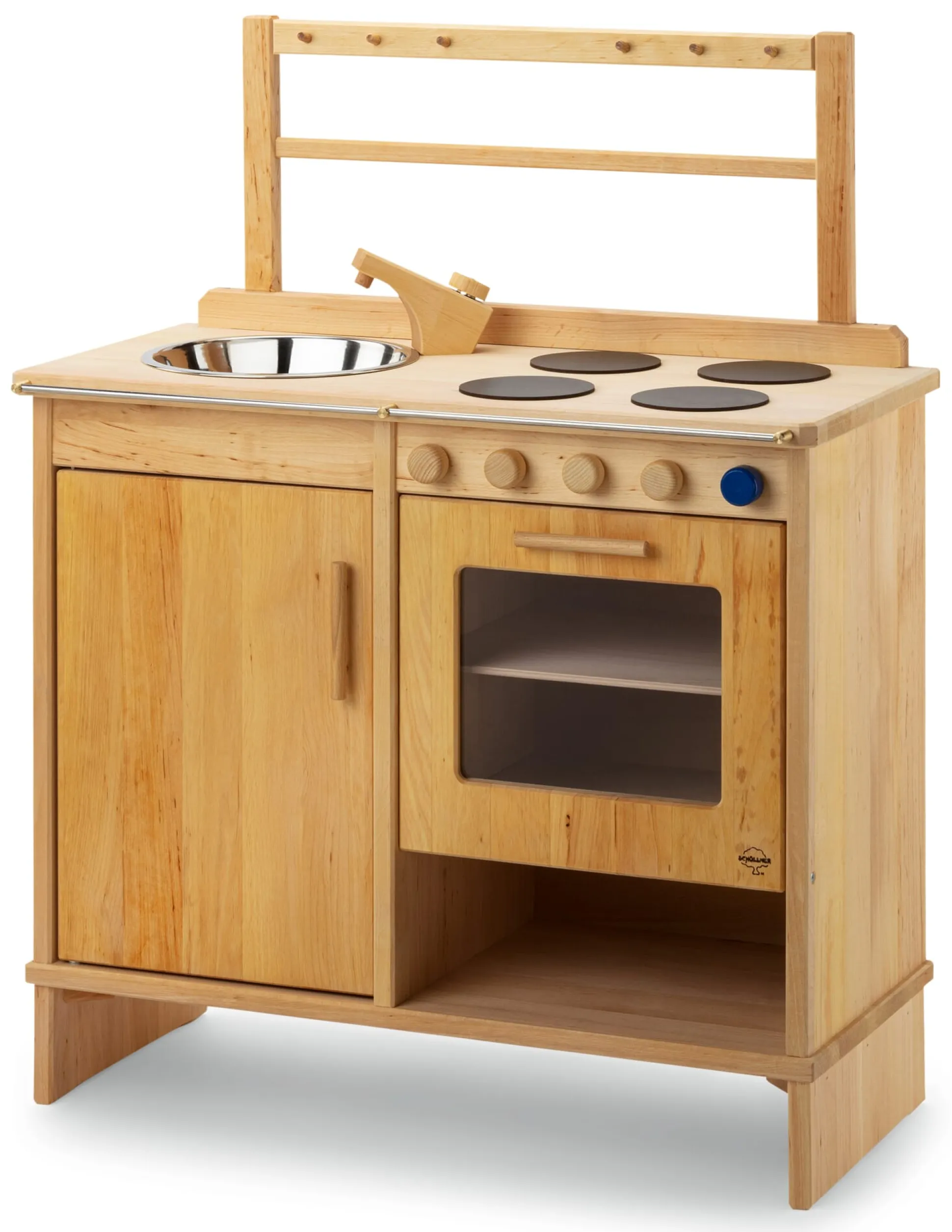 Den erforderlichen Stoizismus bringt diese Kinderküche mit. Sorgsam aus massivem geöltem Erlenholz gefertigt, macht das Spielmöbel gelassen mit, was Ihre Sprösslinge ihm abverlangen. In dem kompakten Küchenblock finden Nachwuchsköch*innen eine sorgfältig nachgebaute Grundausstattung vor: Herdplatten und einen Backofen, eine Spüle mit Edelstahlbecken und Holzarmatur, einen Kühlschrank (auch als Unterschrank zu nutzen) sowie eine aufgesetzte Halterung für Küchenutensilien. Die puristische Gestaltung lässt kindliche Phantasie frei fliegen. Ob Superhelden-Auflauf mit Holzkartoffeln und Filzspiegelei, ob spontane Emailleteller-Wäsche in der Spüle oder Küchenkonzert mit dem Kochlöffel: Angeregt können Kinder hier rühren und stampfen, Einkäufe ein- und ausräumen und vielleicht sogar hingebungsvoll spielerisch den Abwasch erledigen.