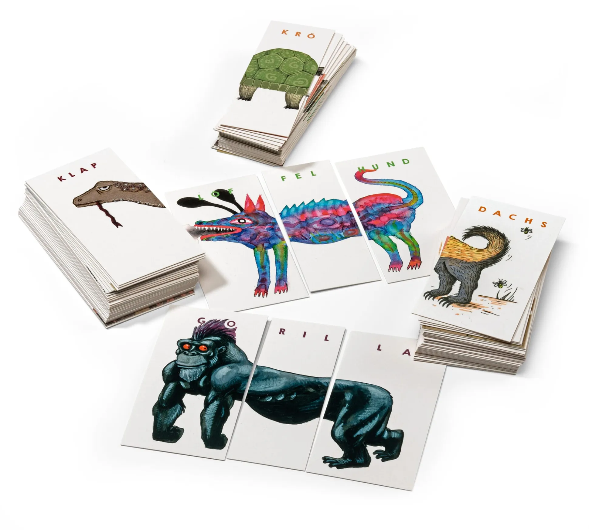 Ein kleiner Zoo mit 32 Tieren, gemalt von 16 namhaften Künstlern, ist Grundlage dieses so außergewöhnlichen wie lustigen Legespiels, in dessen Verlauf die dreigeteilten Tierbilder wieder zusammengefügt werden müssen. Dabei entstehen exotische neue Wesen, die ihren Namen gleich mitbringen, denn auf den jeweiligen Karten mit Kopf, Rumpf und Po befinden sich auch die Namen des Originaltiers, in drei Silben getrennt. So fügen sich nicht nur die Illustrationen neu, sondern mit ihnen auch die Silben und ergeben dabei teils nahezu unaussprechliche Namen.