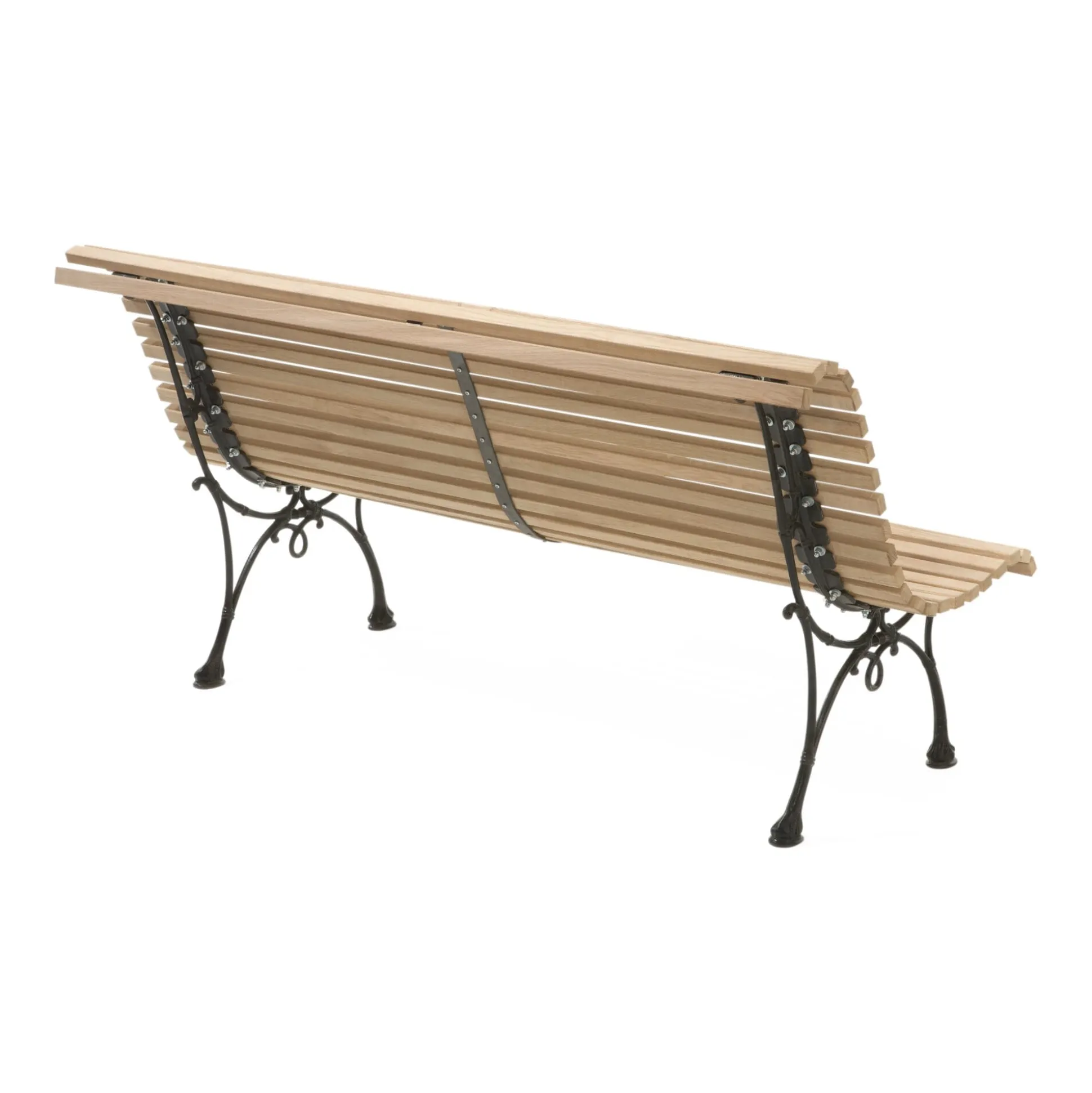 Füße Gusseisen, schwarz pulverbeschichtet. Belattung unbehandeltes Eichenholz in natürlicher Astigkeit (Herkunft Deutschland). Hergestellt in Frankreich und Deutschland. Höhe 79,5 cm, Breite 150 cm, Tiefe 70 cm. Sitzhöhe 40 cm, Sitztiefe 38 cm. Gewicht 31 kg.