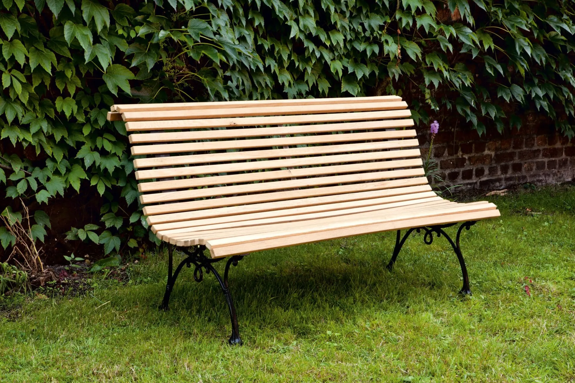Eine traditionelle Park- und Gartenbank, wie sie im Buche steht – mit gusseisernem Untergestell und einer Belattung aus Holz in der typischen geschwungenen, sehr bequemen Form, die jedwede Auf- oder Unterlage überflüssig macht. Das Gestell kommt aus einer Eisengießerei in Lothringen, die seit über 150 Jahren Gartenmobiliar, Laternen, Brunnen, Pflanzgefäße und dergleichen herstellt. Die massiven Eichenholzlatten beziehen wir von einer Lüneburger Schreinerei, das Holz stammt aus einem dortigen Forst. Die Bank wird zerlegt geliefert, das notwendige Befestigungsmaterial und eine Anleitung liegen bei. Nach der Montage bedarf die Bank keiner weiteren Pflege mehr und dient ausschließlich der Entspannung. Falls die im Laufe der Zeit auftretende typische Graufärbung des Eichenholzes nicht gewünscht wird, kann das Holz dann und wann mit einem Pflegemittel behandelt werden.