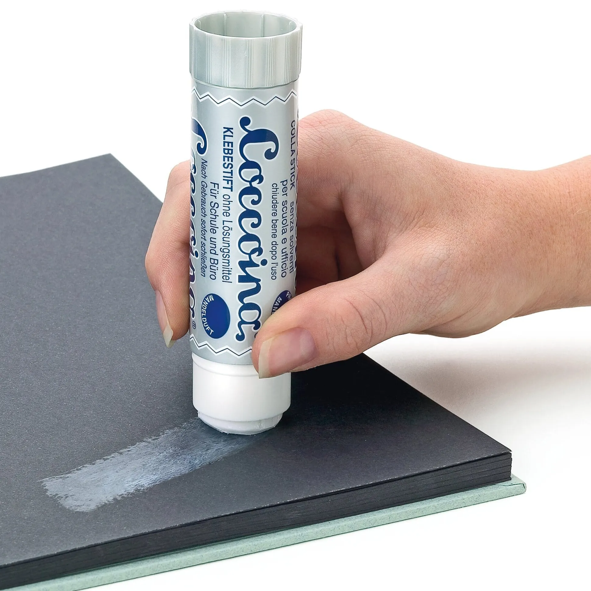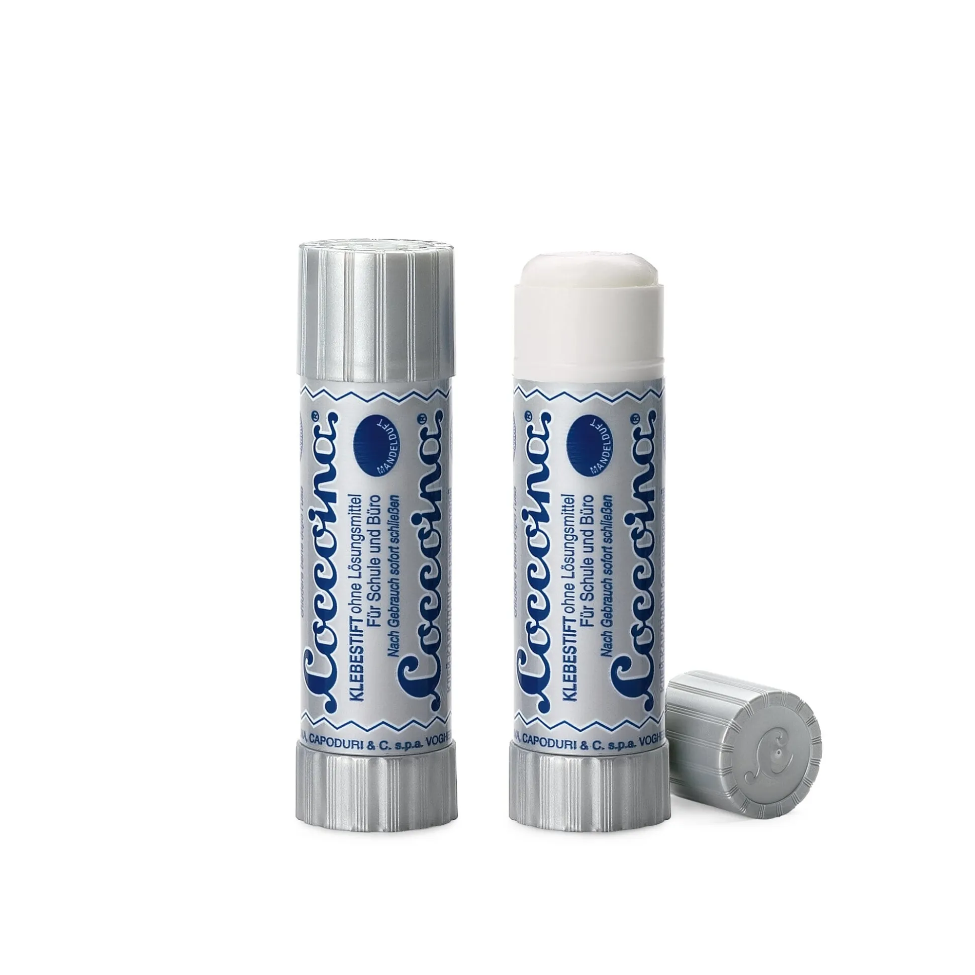 Für alle, denen das Werkeln mit dem weißen Leim nicht geheuer ist: die Coccoina-Klebestifte. Auch sie basieren (wie der Papierkleber Coccoina in der Dose) auf Kartoffelstärke, sind ungiftig – da frei von Lösungsmitteln – wasserlöslich und betören olfaktorisch mit ihrem zarten Mandelduft.