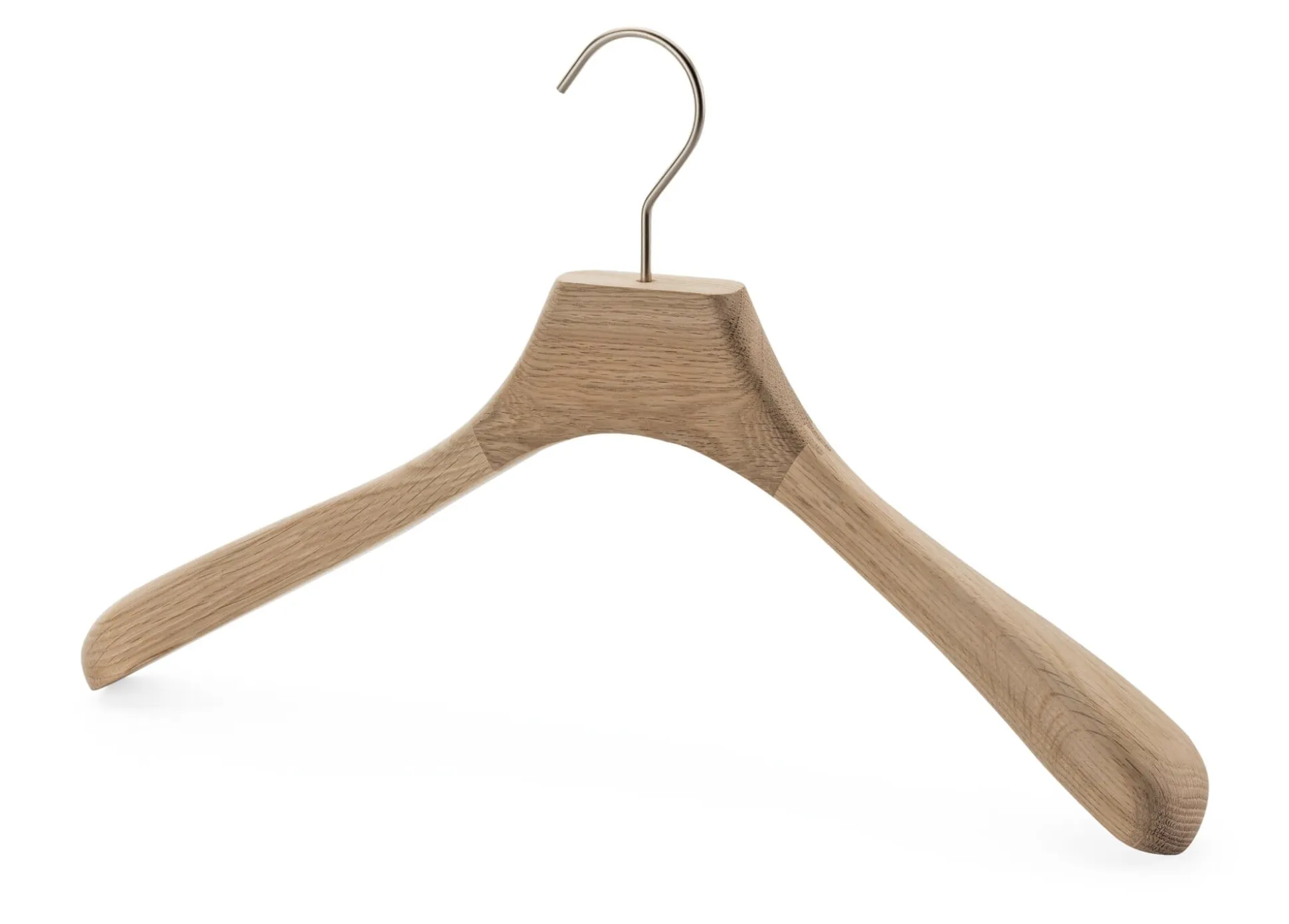 Großer Kleiderbügel, mit breiter Auflagefläche aus massiver Eiche gefertigt und einem matt silberfarbenen stählernen Haken.