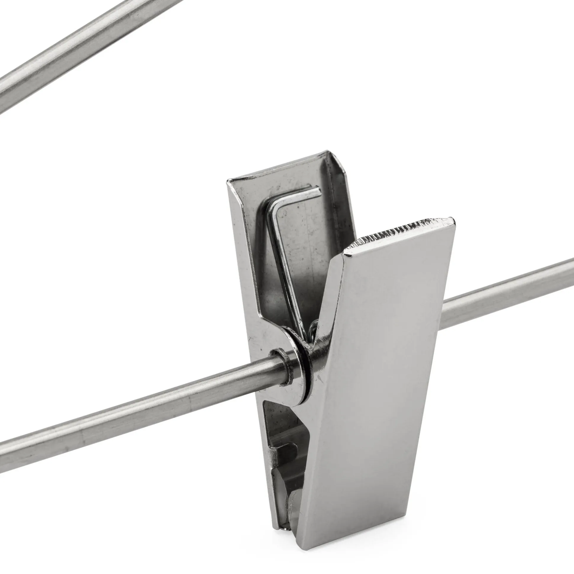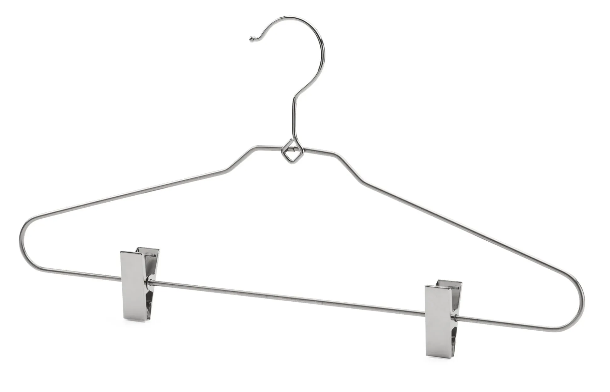 Wir bieten unsere Stahlkleiderbügel in zwei Ausführungen: eine einfache mit Hosensteg und eine mit Klammern für Röcke.