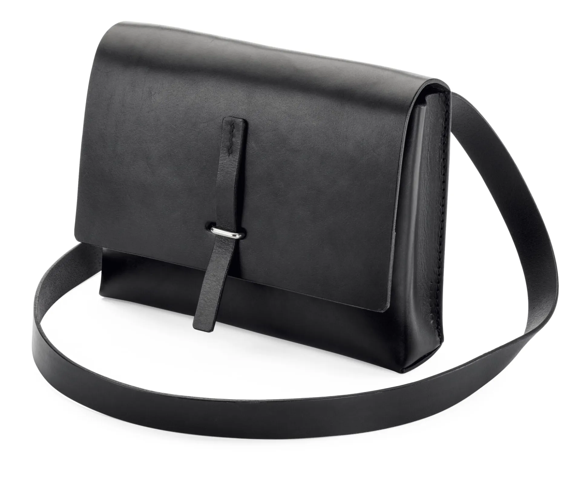 Dass diese kleine Ledertasche auf den ersten Blick recht unscheinbar wirkt, liegt an ihrer optisch absolut schlichten, handwerklich aber umso aufwendigeren Verarbeitung: Der Korpus ist aus einem Stück kräftigen Sattelleders (Stärke 2,5 mm) gearbeitet, das durch Falzen und Einfalten seine Form erhält. Je eine Naht hält die Seitenkanten zusammen, und nur eine weitere ist nötig, um den Taschenumschlag anzubringen. Diese Rückennaht hält gleichzeitig den Trageriemen, durch dessen Position die Tasche eng am Körper anliegt, wenn sie quer über dem Oberkörper getragen wird. Geschlossen wird sie mittels einer kleinen Lederlasche, die durch einen Metallsteg geschoben wird. Dieser stammt eigentlich aus dem Anhängerbau und hält sonst die Gurte und Riemen der Planen in Position.