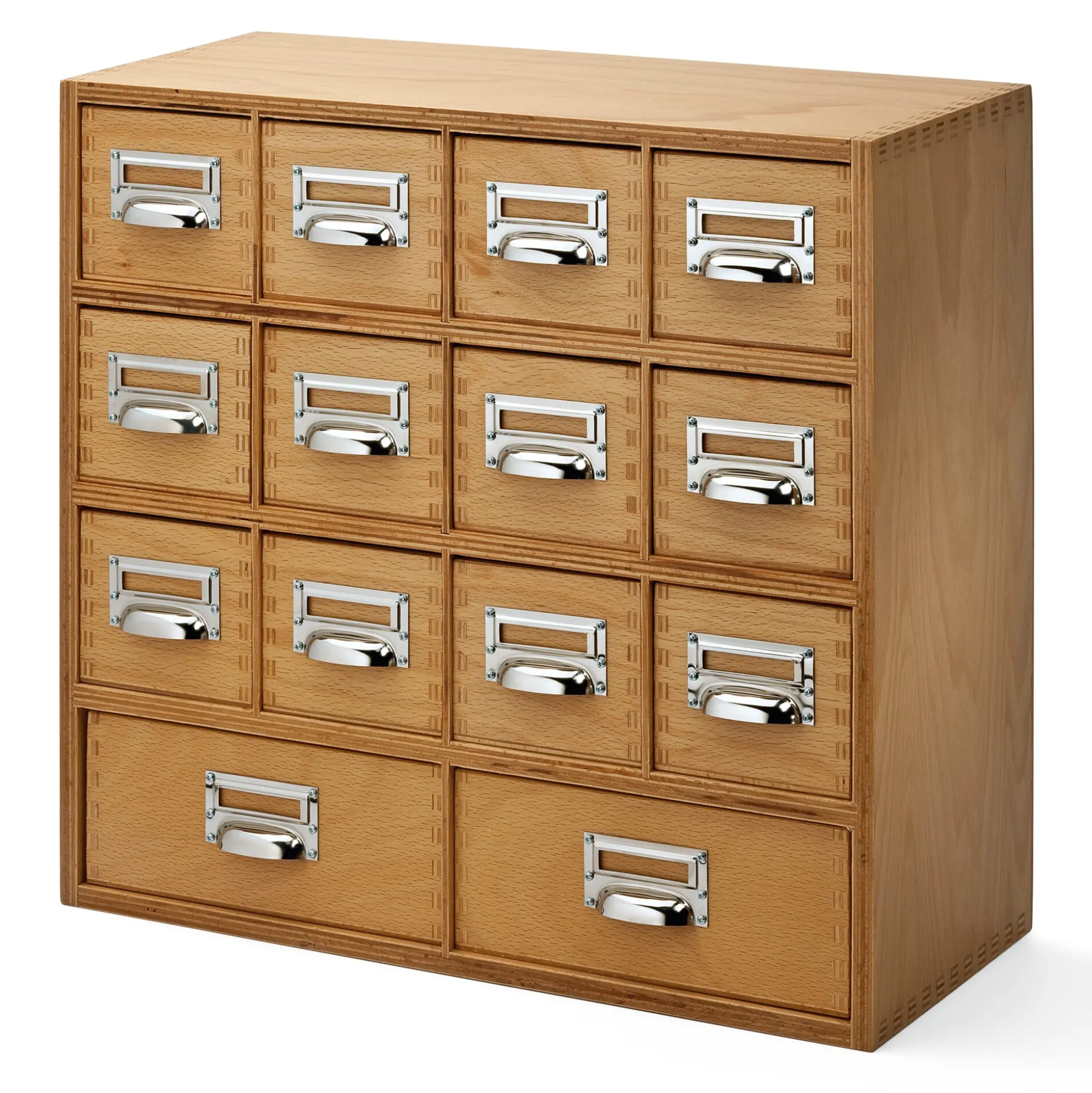 Sperrholz Buche. Griffe und Rähmchen (für Karten von 5 × 1 cm) aus vernickeltem Stahlblech. Höhe 42 cm, Breite 45 cm, Tiefe 18 cm. Große Schubladen: H 9 × B 21 × T 17,5 cm. Kleine Schubladen: H 9 × B 10 × T 17,5 cm. Gewicht 10,5 kg.