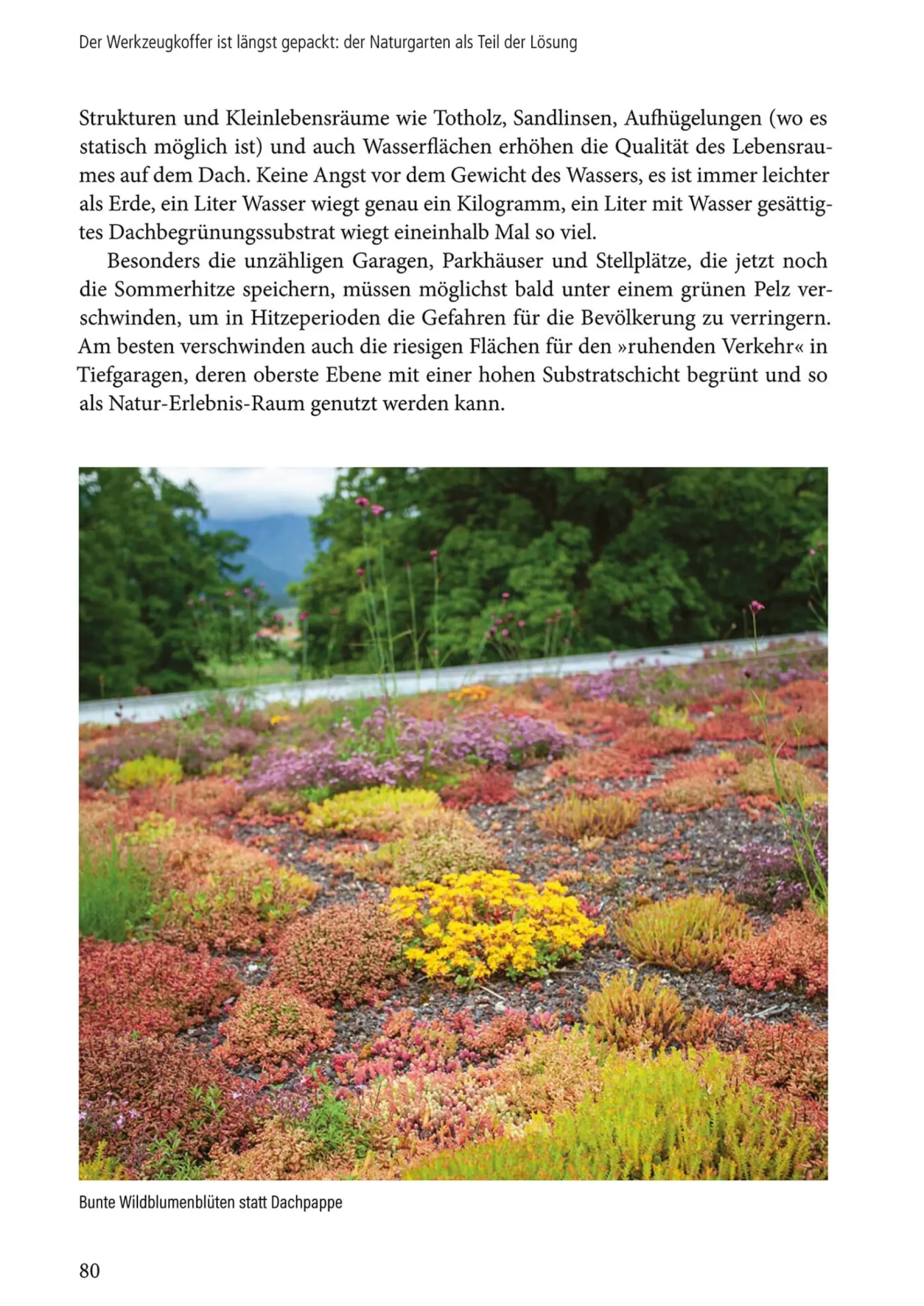 Das verständlich aufbereitete Hintergrundwissen motiviert, im eigenen Garten selbst erfolgreiche Lösungsmöglichkeiten zu entwickeln und die Probleme ganzheitlich anzugehen. Kompetent und praxisnah stellt sie den gut gefüllten Werkzeugkoffer der Naturgärtnerinnen und Naturgärtner vor, um mit den Herausforderungen wie Trockenheit oder Starkregen besser umzugehen. Die Anlage versickerungsoffener und naturnah bepflanzter Flächen gehört ebenso dazu wie die Auswahl klimafester heimischer Pflanzen als Lebensräume für Tiere, die biodiversitätsfördernde Pflege und das Sammeln des Regenwassers.
