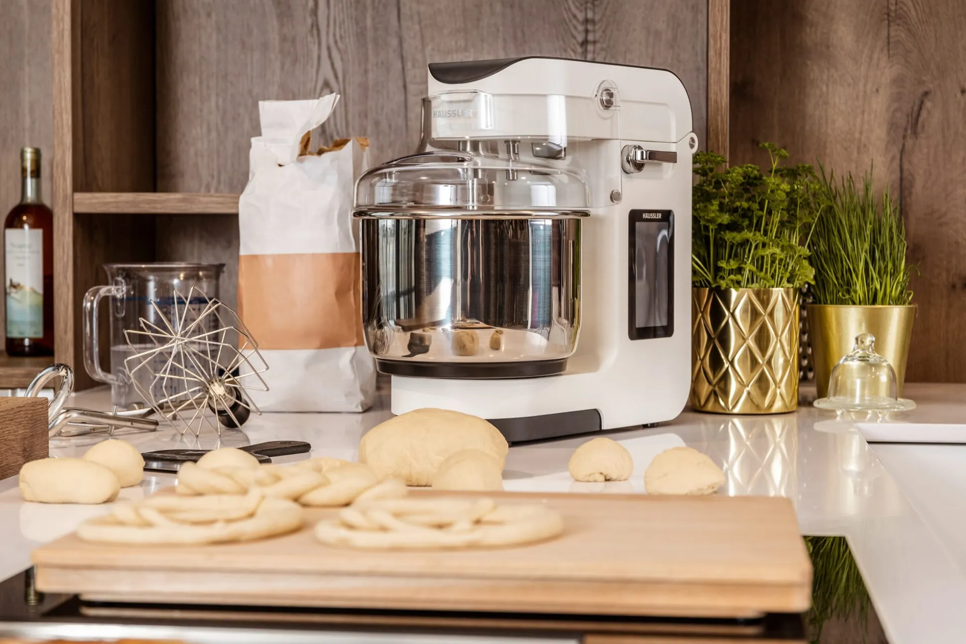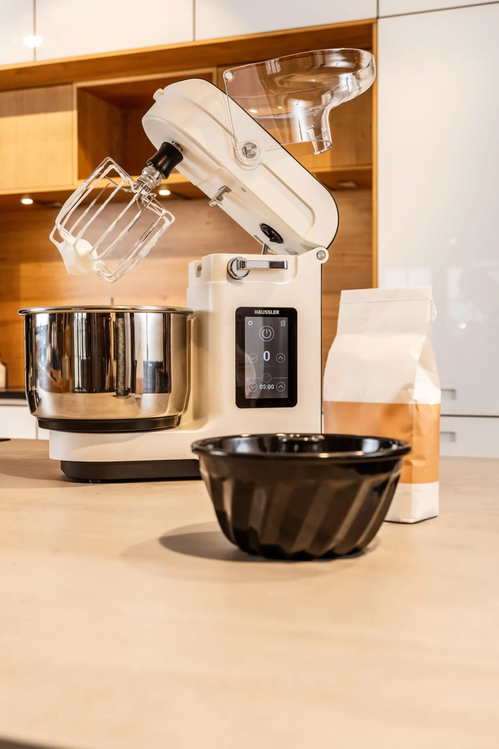 Die Gewerbemaschine für den Hausgebrauch bewältigt souverän alle Arten von Teig. Bei aller Profi-Technik – in ihrem Inneren arbeitet ein ausdauernder, aber laufruhiger Permanentmagnetmotor – ist die Maschine so kompakt gebaut, dass sie bei Nichtgebrauch fix unter den Hängeschrank geschoben und somit dauerhaft auf der Arbeitsplatte stehen bleiben kann. Das Touchdisplay mit integrierter Zeitschaltuhr und einprogrammierten Rezepten vereinfacht die Bedienung. Die Knetzeiten für Ihr Hausbrot und andere Lieblingsgebäcke können Sie gleich mit einprogrammieren. Im laufenden Betrieb schützt eine Schüsselabdeckung den Teigkesselinhalt. Sie ist mit einer Aussparung versehen, sodass jederzeit Zutaten hinzugefügt weden können, während der Knethaken seine Runden dreht.