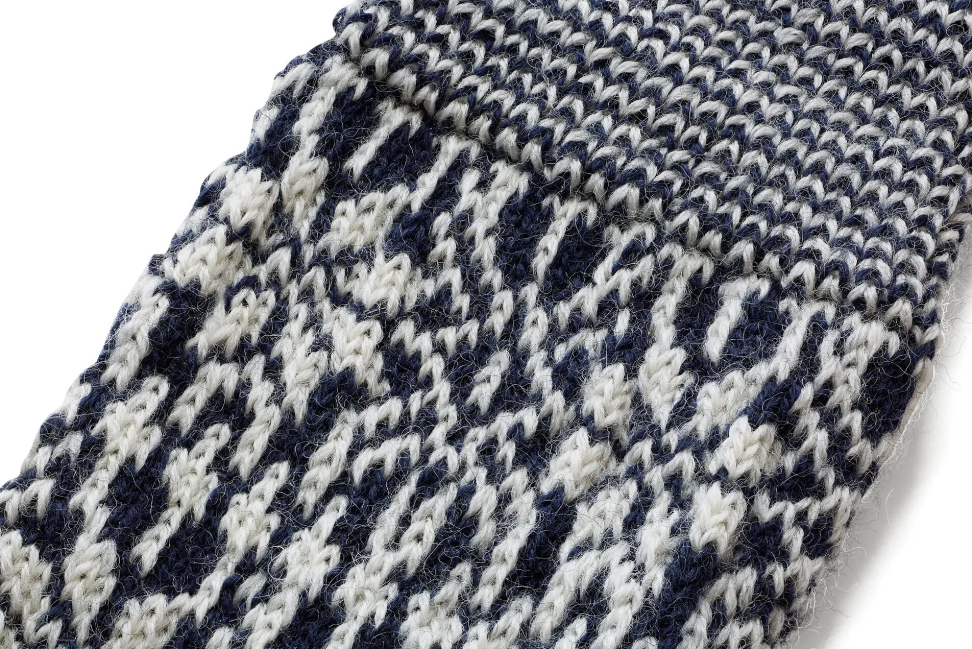 Die klaren Sternenmuster dieser Kniestrümpfe entstehen auf eigens dafür eingerichteten Jacquardstrickmaschinen, auf denen ein Schurwollzwirn dreifädig dicht und wärmend verstrickt wird. Die Fußsohle ist als Patentstrick ausgeführt, was der Passform zusätzlich zugute kommt. Das lange Bündchen in 1/1-Rippe ist mit einem elastischen Gummifaden gestrickt, so sitzt es auf ganzer Länge perfekt, lässt sich aber auch umschlagen.