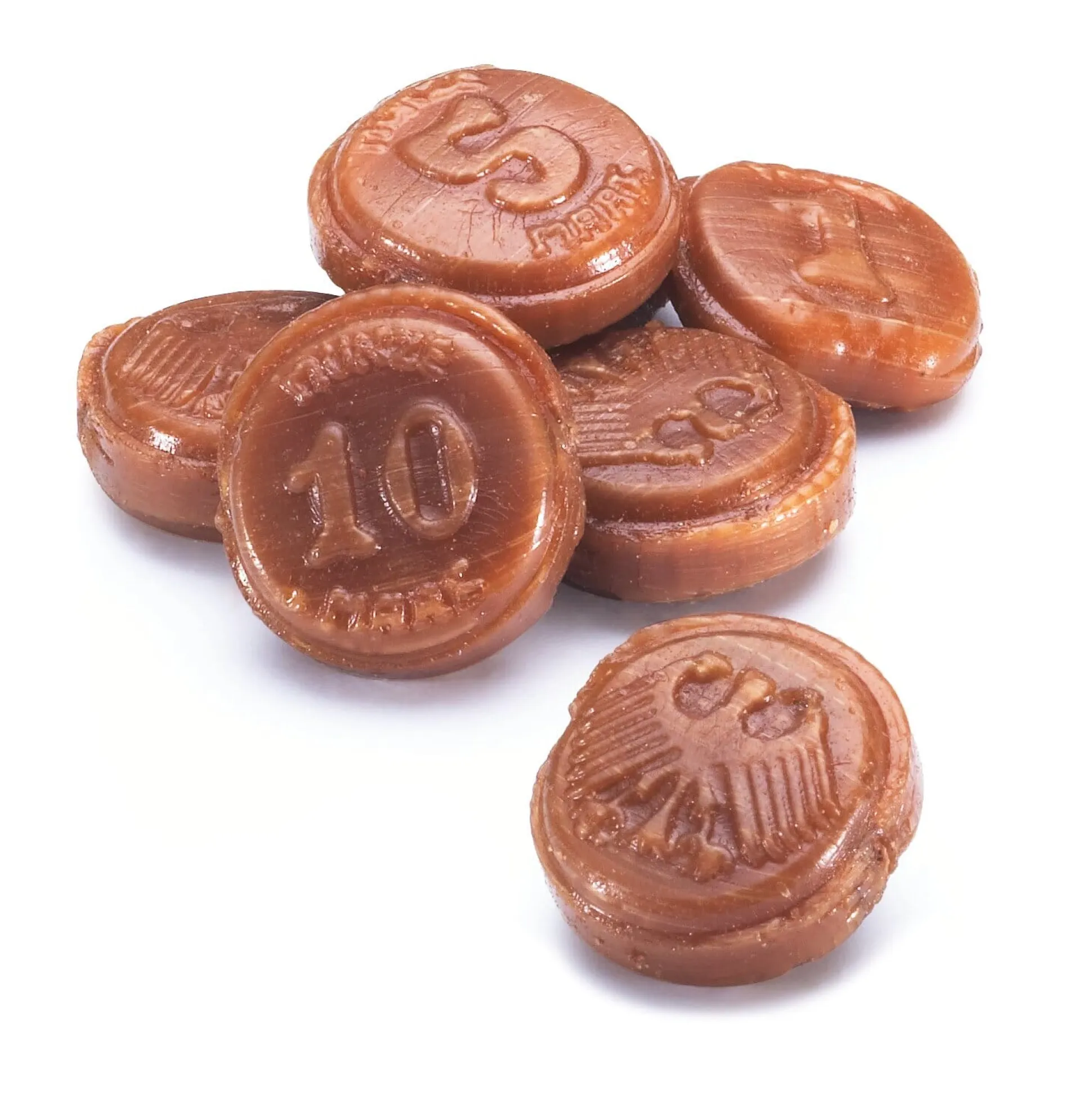 Diese süßen Knuspertaler bergen in ihrem Inneren eine Kakaofüllung. Die Form ist klassisch: Die Rückseite der Genussmünzen zeigt noch den Bundesadler. Sie können sie lutschen oder zerbeißen.