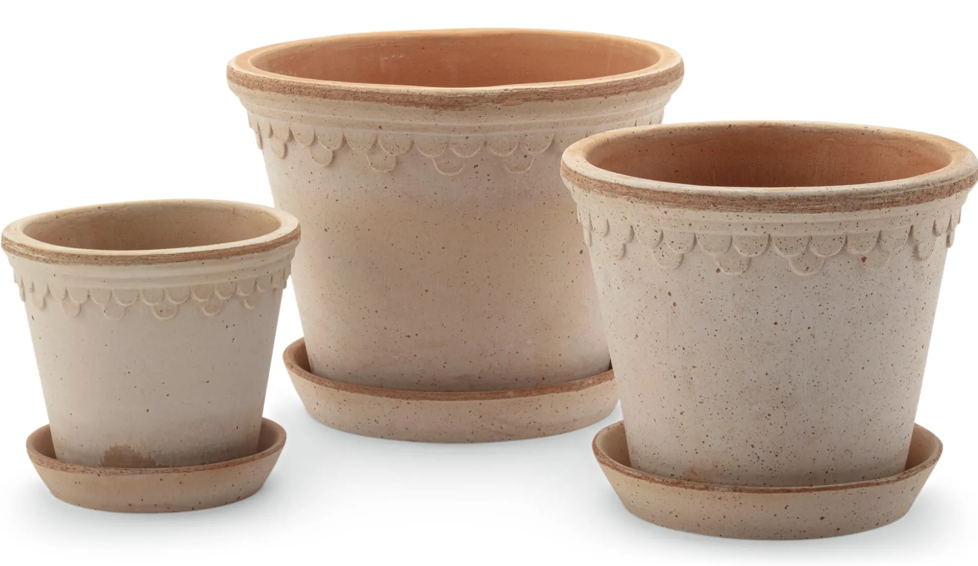 Königlichen Ursprungs ist der Entwurf, der den Københavener-Töpfen von Bergs Potter vorausging. Ähnliche Modelle gab es schon einmal um das Jahr 1860 herum. Sie stammten sämtlich aus dem „dänischen Versailles“, wie Schloss Fredensborg im Norden der Insel Seeland bis heute genannt wird. Friedrich der IV. von Dänemark und Norwegen ließ die Schlossanlage zwischen 1720 und 1722 als Sommerresidenz und Jagdschloss erbauen. Eine Töpferwerkstatt muss wohl zum königlichen Besitz gezählt haben. Steffen Berg, Bergs-Potter-Geschäftsführer der zweiten Familiengeneration, fand die historischen Pflanzgefäße durch Zufall in einem Gewächshaus einer aufgelassenen Gärtnerei und ließ sich zu einer Neuauflage nach eigenem, dezent modernisiertem Entwurf inspirieren. Besonders gelungen ist das zurückhaltende Schuppendekor. Wir schätzen diese Töpfe auch deshalb, weil der passende, aus demselben Ton getöpferte Untersetzer gleich mitgeliefert wird. Nicht nur, dass beide Teile zusammen ein harmonisches Gesamtbild ergeben – die Untersetzer helfen ebenso dabei, Gießwasser effizienter einzusetzen, da sie Überschüssiges auffangen und zur späteren Verwendung bereithalten. Bei den doch eher kleineren Topfgrößen ist das ein nicht zu unterschätzender Vorteil, gerade wenn die Gefäße draußen auf dem Balkon oder auf der Terrasse stehen, wo in warmen Sommern ohnehin häufiger gegossen werden muss.