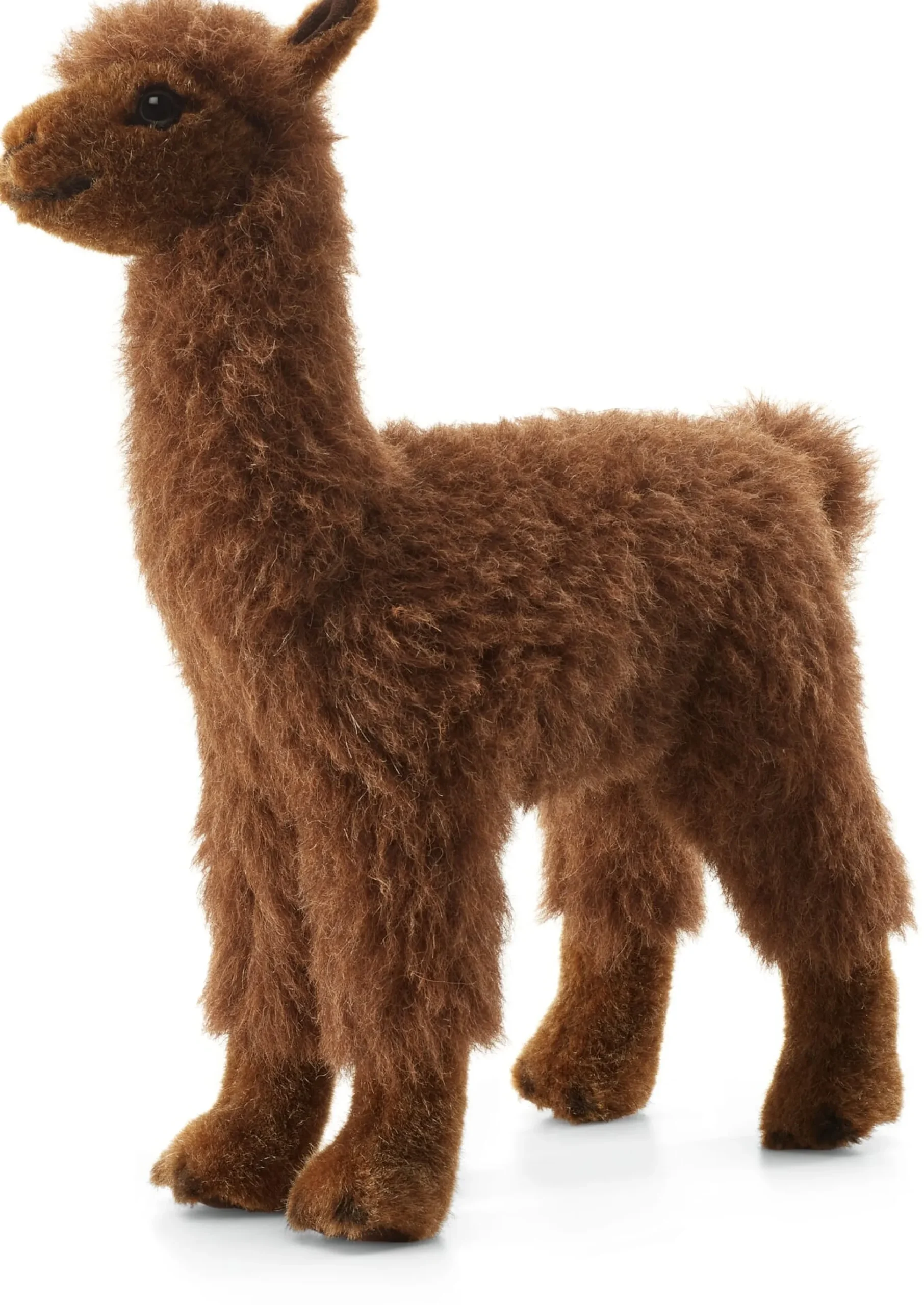 Mit ebendiesem flaumweichen Haar ist auch das Kösener Alpaka gearbeitet. Bis auf Gesicht und Füße, die mit kurzflorigem Webplüsch überzogen sind, schmiegt sich das Alpaka mit dem, was es ausmacht, in Ihre Arme: mit echtem feinem Alpakahaar. Der gesamte Korpus des Tieres ist fest mit Füllwatte ausgestopft, daher können Sie das Alpaka guten Gewissens auch einmal aus den Händen geben und aufstellen, sodass es mit diesem berühmten feuchten Blick in die Welt schaut – vollkommen liebenswert und ohne zu spucken.