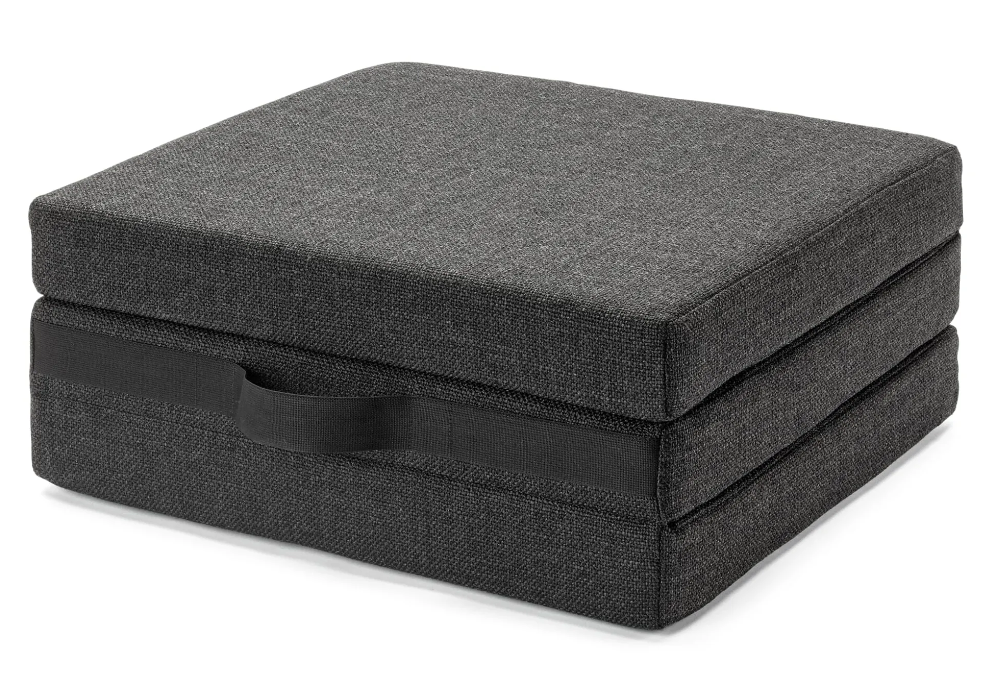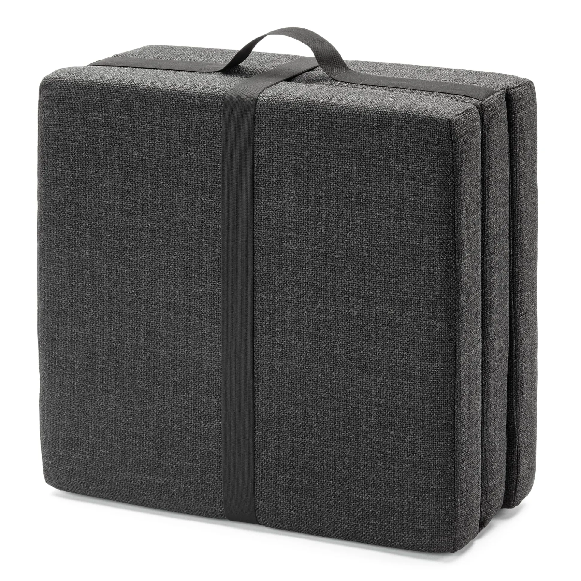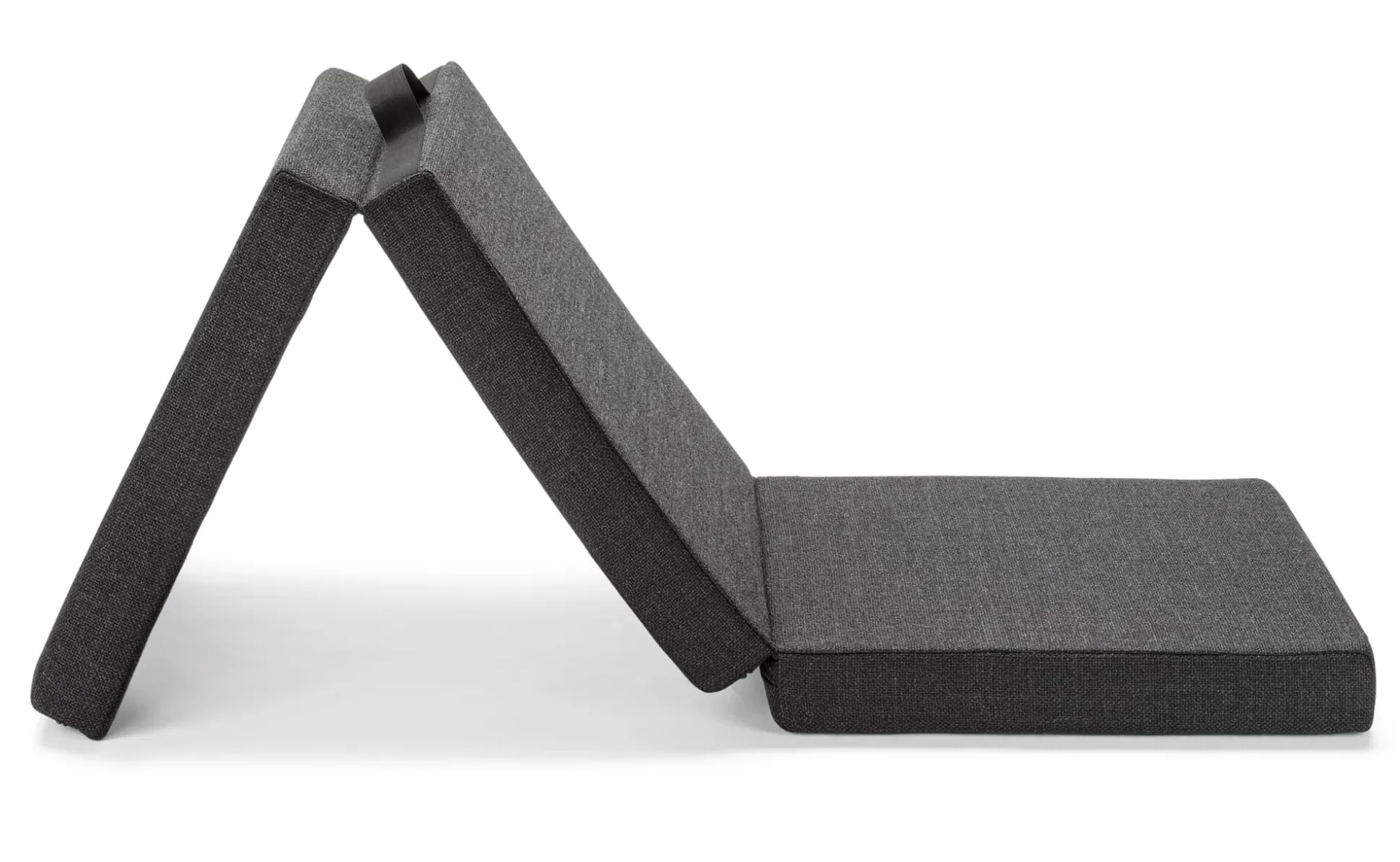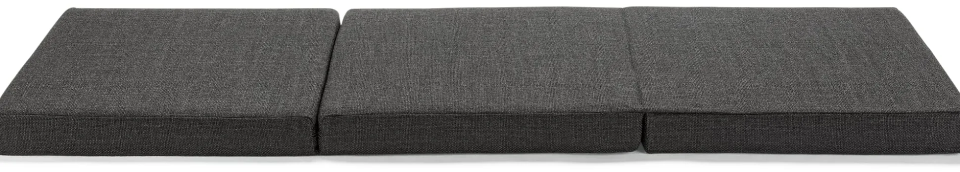 Die Koffermatratze: ein mobiles Gästebett, leicht zu verstauen und zu transportieren. Die einzelnen Segmente der dreiteiligen, klappbaren Matratze sind miteinander verbunden und bilden ausgeklappt eine durchgehende Liegefläche von B 66 × L 189 × H 9 cm. FLEX PLUS ist mit einem festen Schaum ausgestattet, was sie bei regelmäßiger Nutzung belastbarer und robuster macht. An die Wand gelehnt auch als Sessel mit Rückenlehne verwendbar.