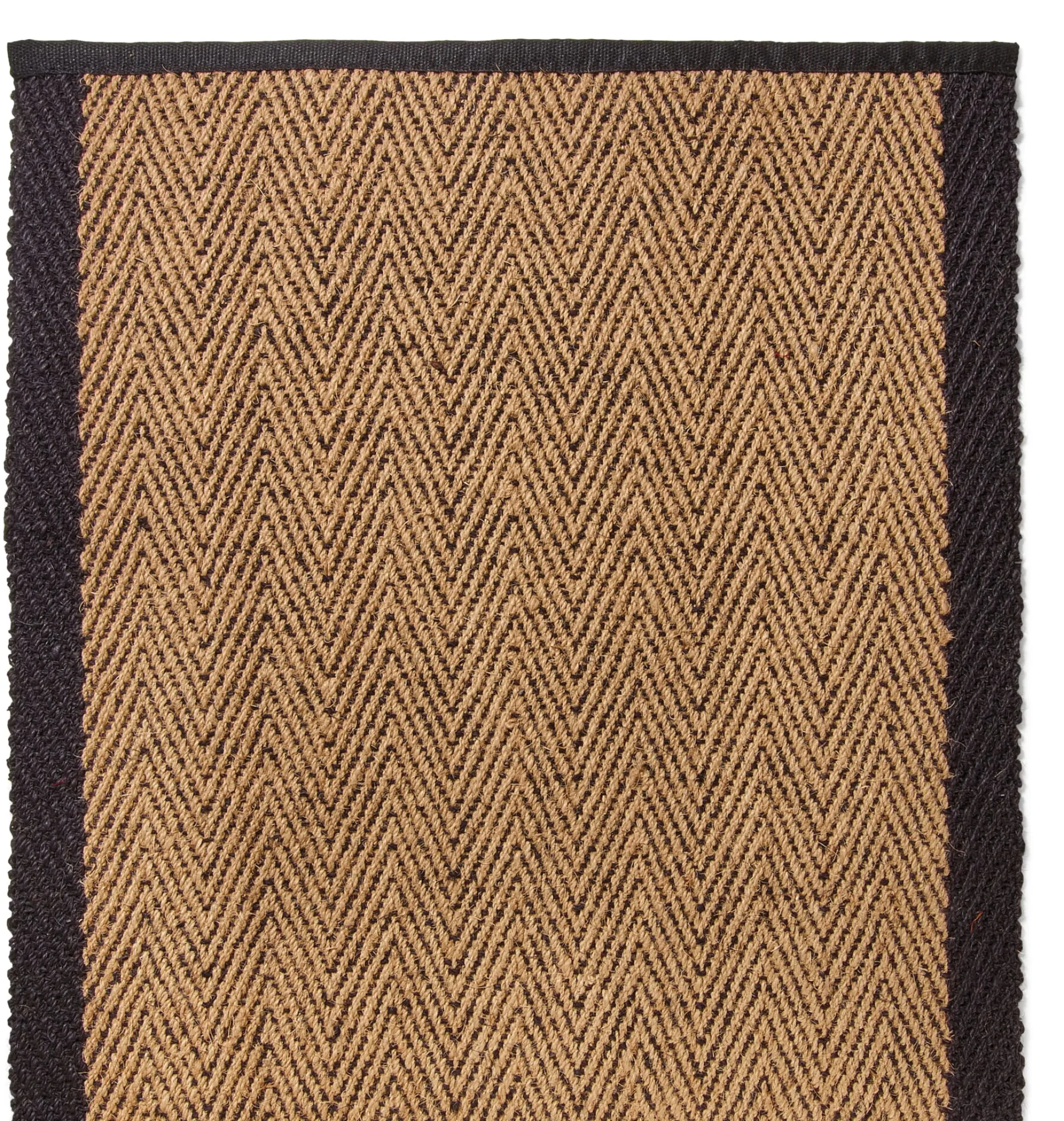 Das Fischgratmuster ist durchgehend mit zwei Farben gewebt: Natur und Schwarz. Mit einem etwa 7 cm breiten schwarzen Rand.