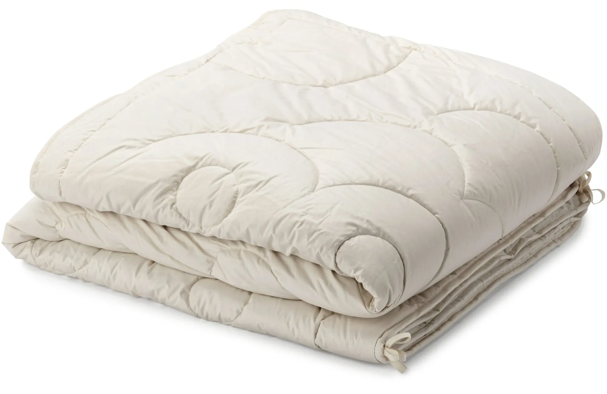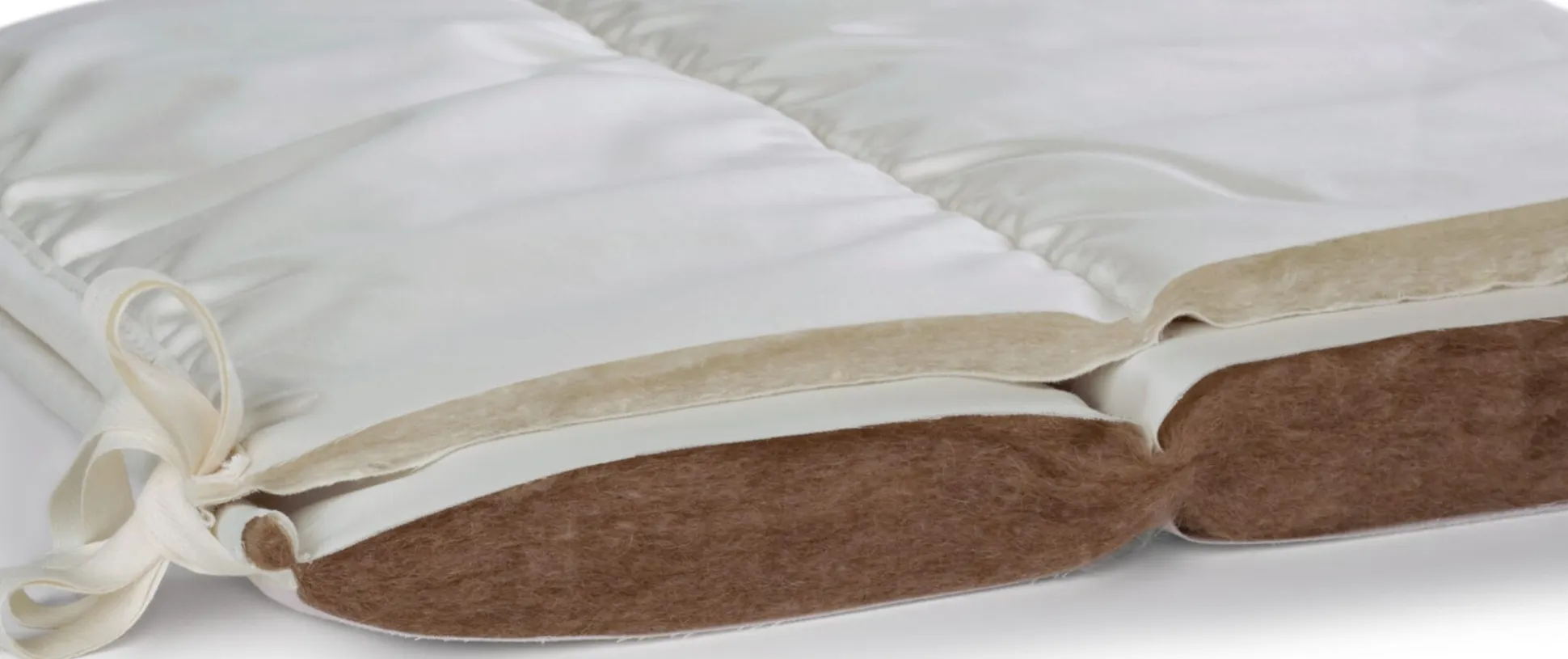Eigentlich ist dies nicht eine, sondern es sind drei Decken: zunächst eine leichte, dünnere, mit Wildseide gefüllte für den Sommer sowie eine zweite Decke mit wärmendem Kamelflaumhaar für die Übergangszeit. Beide haben einen dichten Perkalbezug aus 100% kbA-Baumwolle – und lassen sich in der frostig-kalten Zeit zu einer dicken, warmen Winterdecke zusammenbinden.
