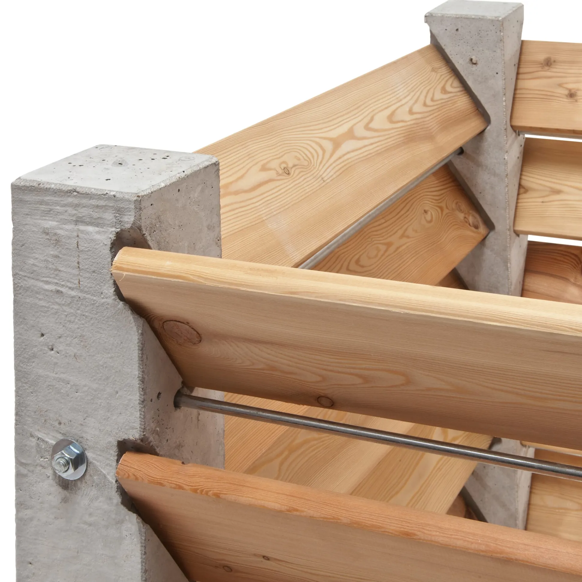 Die Pfosten werden von Zugstangen zusammengehalten und verschraubt. Unser Lieferant empfiehlt, sie auf vier Gehwegplatten zu platzieren, damit sie nicht in den Erdboden einsinken. Zur Aufnahme der Kiefernholzbretter sind die Betonpfosten mit passenden Nuten versehen, in die die Bretter lose eingelegt werden – eine weitere Befestigung benötigen sie nicht. Praktisch: So können, um ausreichend Raum zur Entnahme des gereiften Komposts zu schaffen, auch die unteren Bretter ohne großen Aufwand entnommen werden.