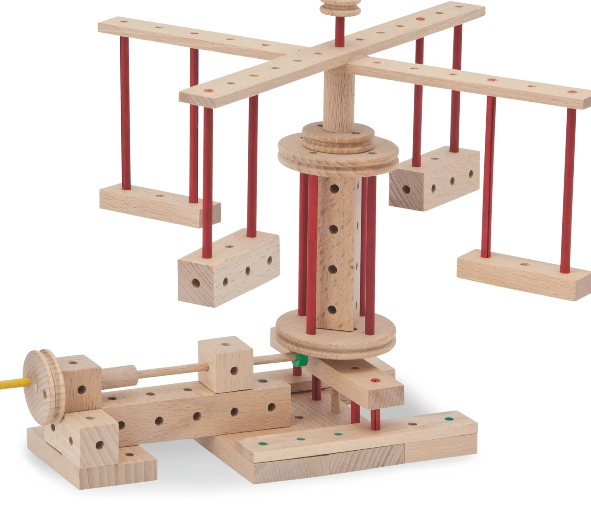 Langweilt Ihren Sprössling das Stapeln einfacher Holzklötze und das Errichten starrer Bauwerke? Ab einem Alter von fünf Jahren hat ein Kind gewisse (fein-)motorische und kognitive Fähigkeiten entwickelt und sucht nach neuen fesselnden Herausforderungen. Nach funktionstüchtigen Konstruktionen wie einer Windmühle, deren Flügel kreisen, oder einem Turner, der um die Reckstange wirbelt; wie einem Flugzeug, das seinen Propeller drehen lässt, einem Rennwagen, der rasant davonschnellt, oder einem Traktor, der gemütlich über den Spielteppich rollt. Dieser Konstruktionsbaukasten eröffnet (nicht nur) Kindern eine Spielwelt, in der Kreativität und konstruktives Verständnis spielerisch gefördert und unterstützt werden.