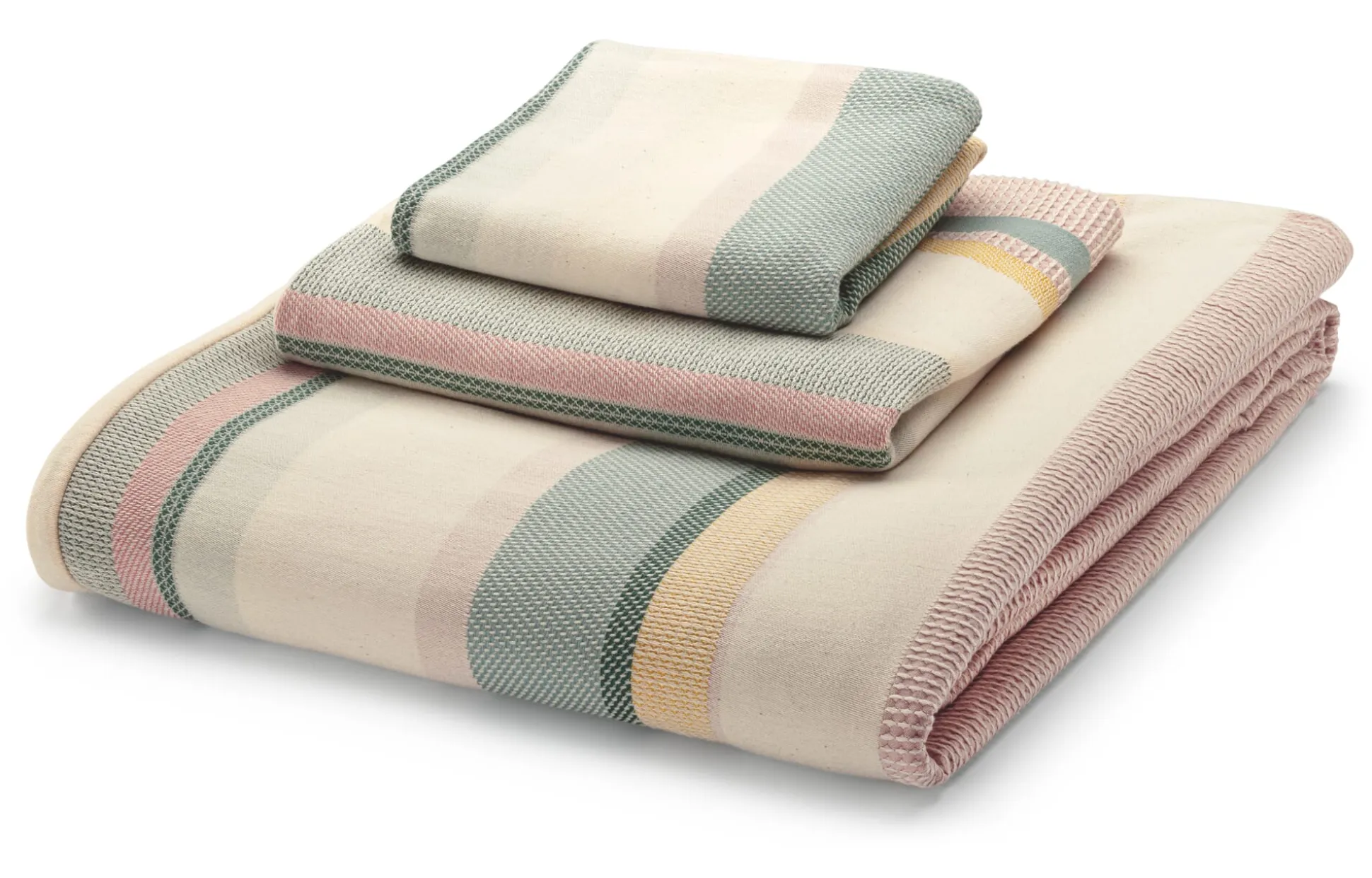 Diese Bettwäsche hat uns doppelt beeindruckt: Zum einen wird hier gewaschene Baumwolle verwendet, wodurch die Wäsche unglaublich weich und hautfreundlich ist. Sie besitzt mit 250 g/qm ein für Bettwäschen recht hohes Materialgewicht und ist deswegen besonders im Winter angenehm und wärmt zusätzlich. Zum anderen überraschen die Streifen nicht nur mit der gelungenen Farbkombination, sondern auch durch ihre Webart. Denn im Unterschied zum köperbindigen Fond mit seinem diagonalen Webbild sind die Streifen meist in anderen Bindungen, zum Beispiel in Waffel- oder Leinwandbindung, gewebt. Dies verleiht dem Gewebe eine strukturierte Oberfläche, dennoch liegt es dank der verwendeten feinen Baumwollgarne angenehm weich auf der Haut. Für die bunten Streifen werden – nicht selbstverständlich – gefärbte Garne eingesetzt. In der Kette kommt ein fester Zwirn (Garnstärke 51/2 Nm) zum Einsatz, im Schuss ein voluminöseres Einfachgarn der Stärke Nm 27. Letzteres verleiht dem Gewebe eine schmiegsame Oberfläche, dank der Köperbindung ist es strapazierbar und langlebig.