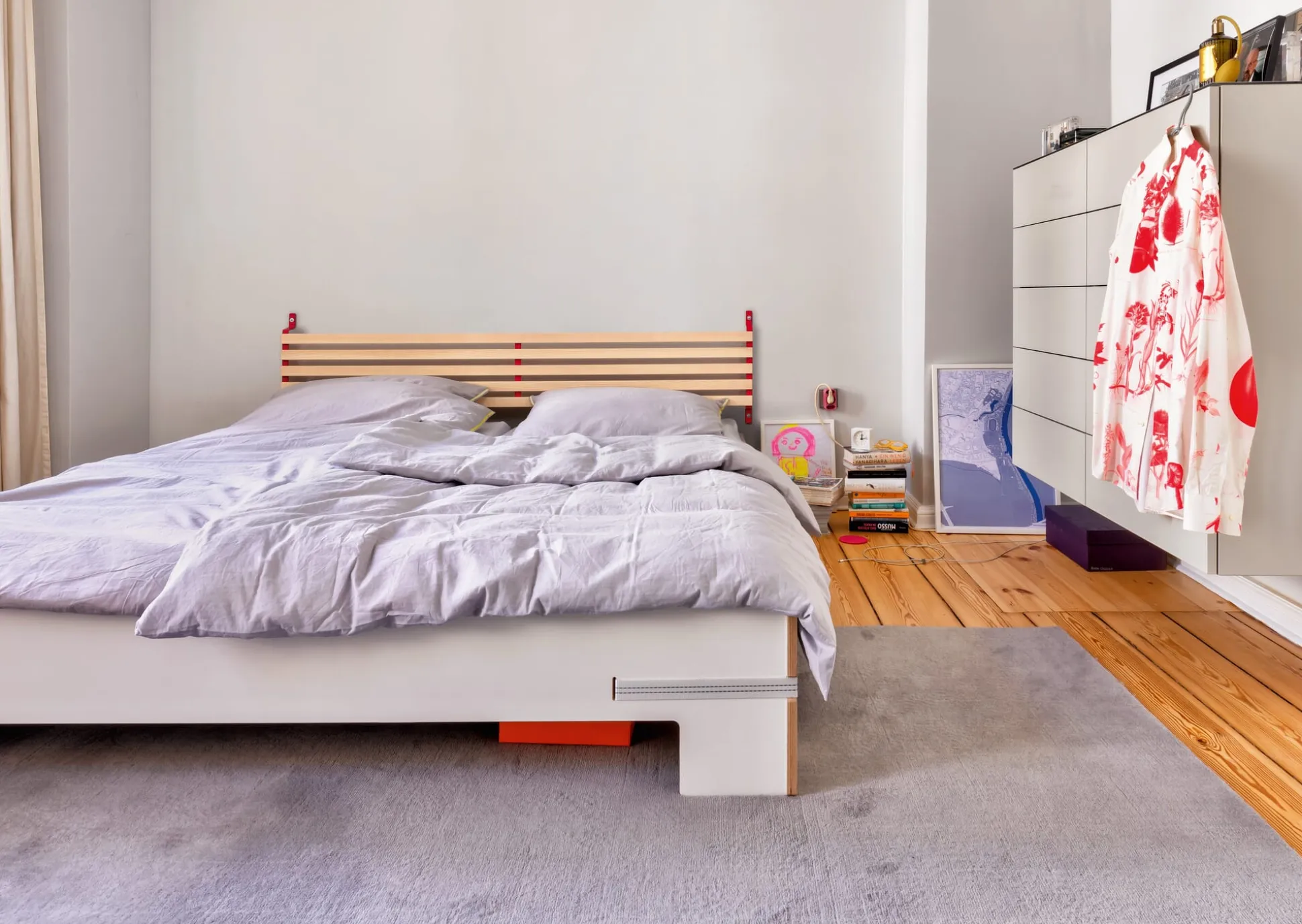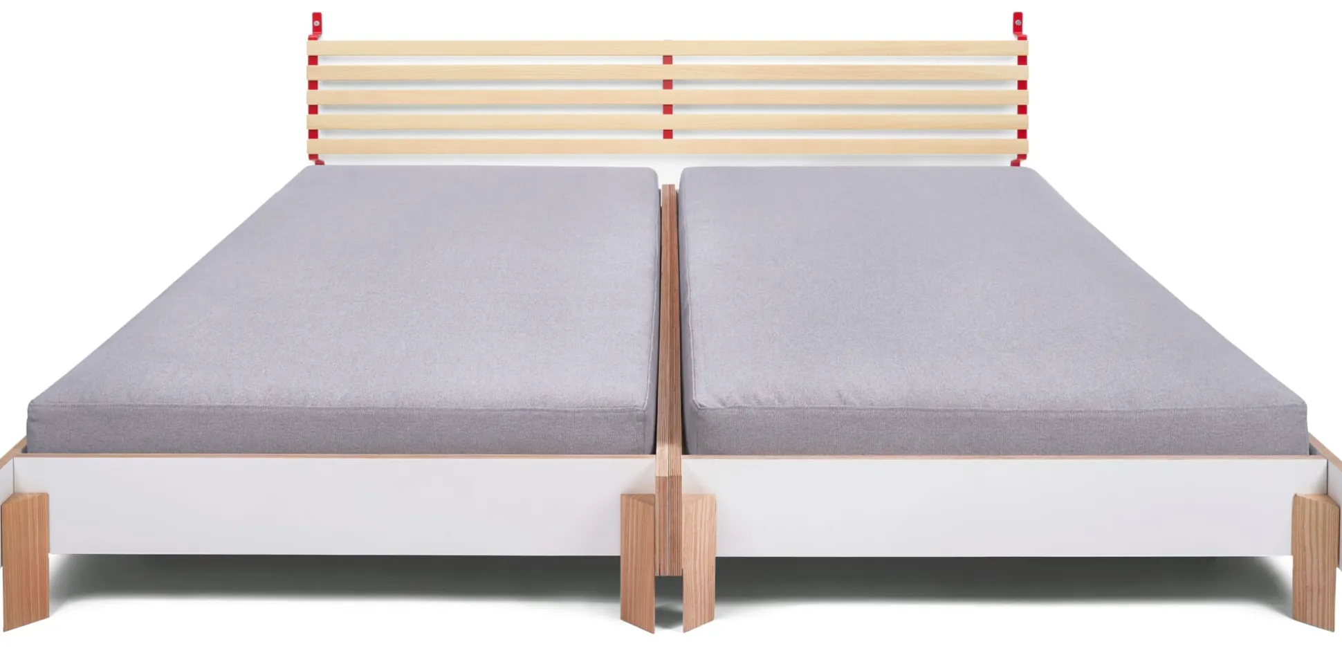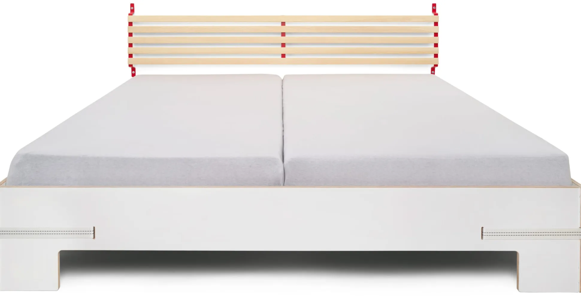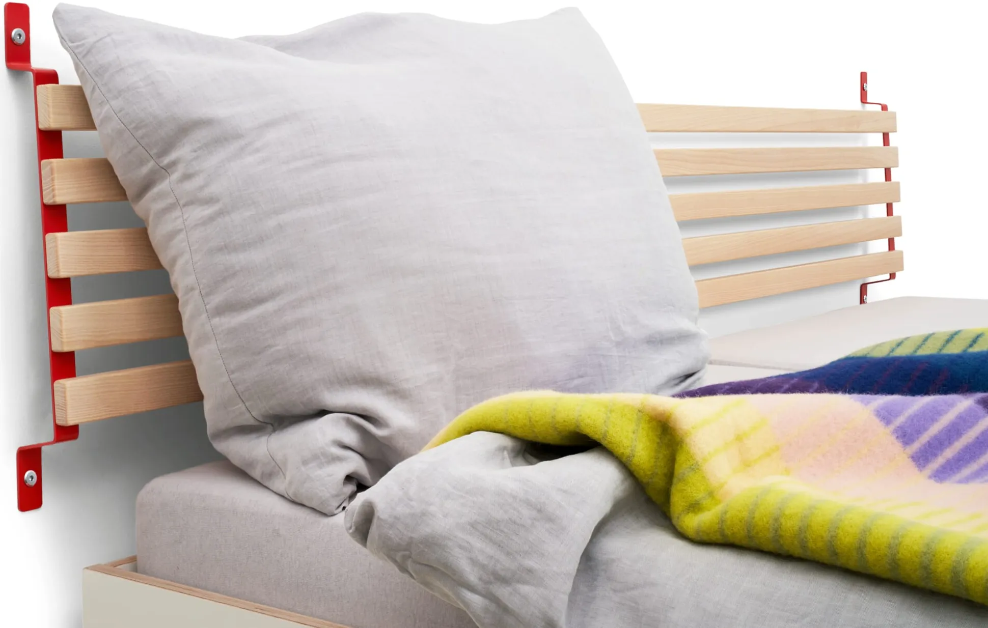 SCHMIEGER ist ein universell einsetzbares Kopfteil und Rückenlehne. Die naturbelassenen und samtweich geschliffenen Leisten aus Eschenholz sind flexibel und geben bei Belastung leicht federnd nach. Sie reagieren beim Anlehnen auf Körperdruck und bieten angenehmen Komfort. Kissen bieten sie Halt, Decken lassen sich darüber hängen. In seiner schlichten Formgebung und mit seinem Materialeinsatz passt sich SCHMIEGER diskret an und ergänzt Betten und Liegen verschiedenster Art. Als Kopfteil ist es für annähernd jedes Bettbreitenmaß gedacht, denn ein eventueller seitlicher Überstand ist Teil der Gestaltungsidee. Wir empfehlen SCHMIEGER für schmale Einzelbetten wie für breite Doppelbetten, speziell für die Betten GURTBETT und SIMPLON aus unserem MAGAZIN-Sortiment ist das Kopfteil geeignet. In Verbindung mit längs an der Wand stehenden Liegen – wie beispielsweise des stapelbaren Bettes STIEGE – erfüllt SCHMIEGER seine Rolle als komfortspendende Rückenlehne. Die Montage über die beiden an der Wand zu montierenden Metallbügel ist denkbar einfach, Schrauben und Dübel gehören zum Lieferumfang.