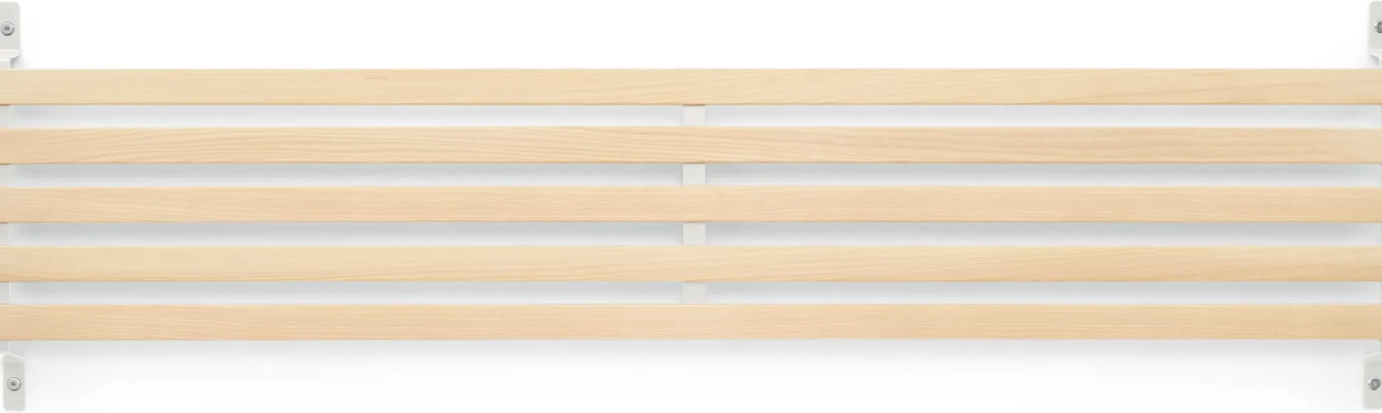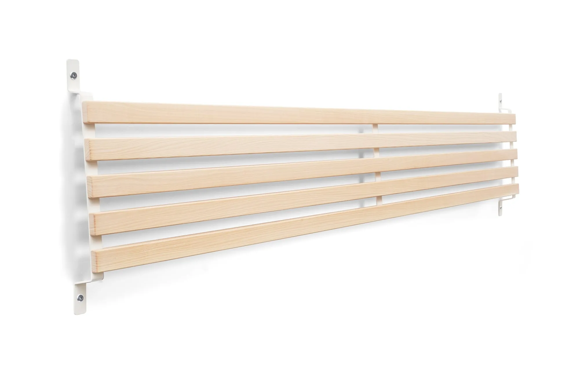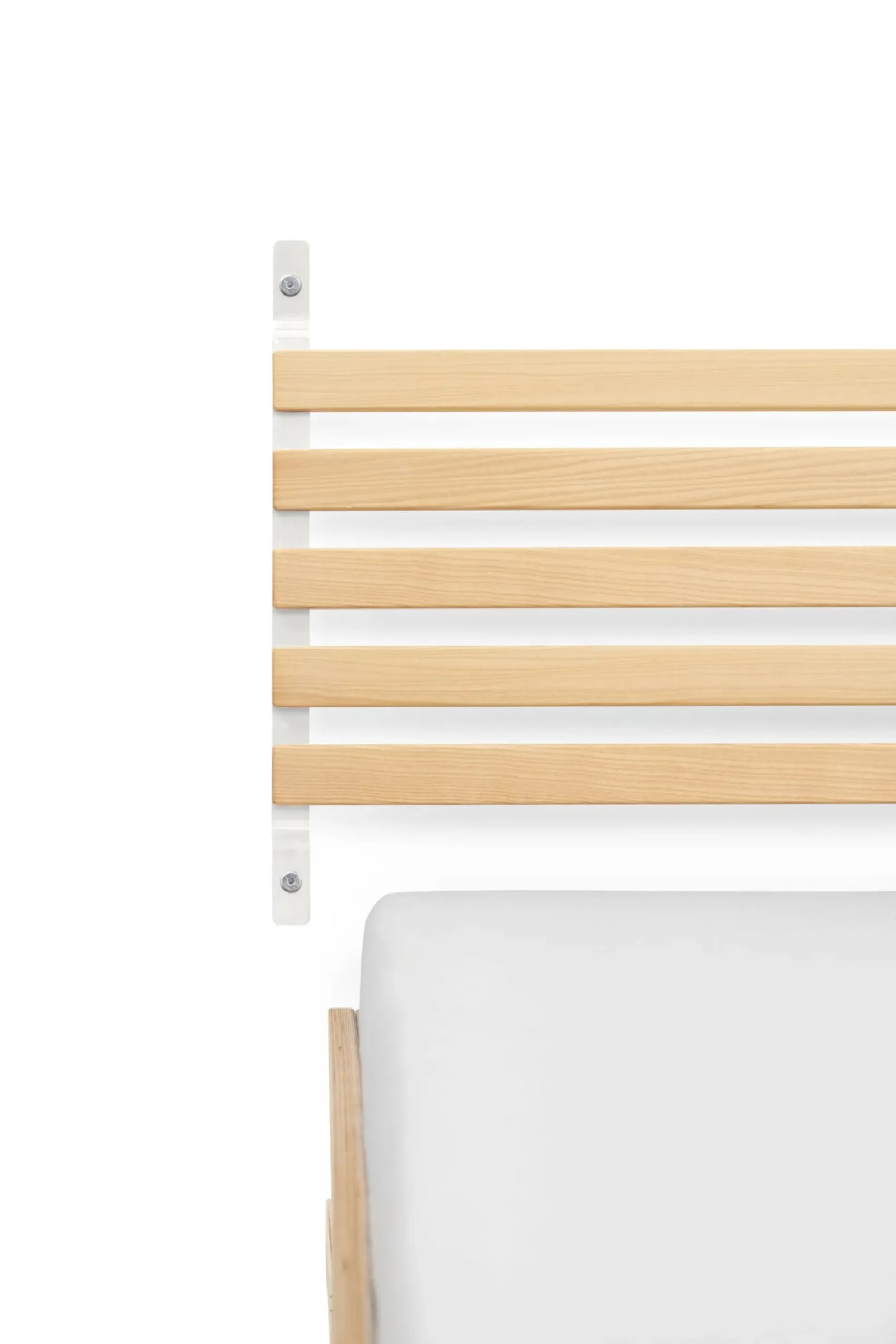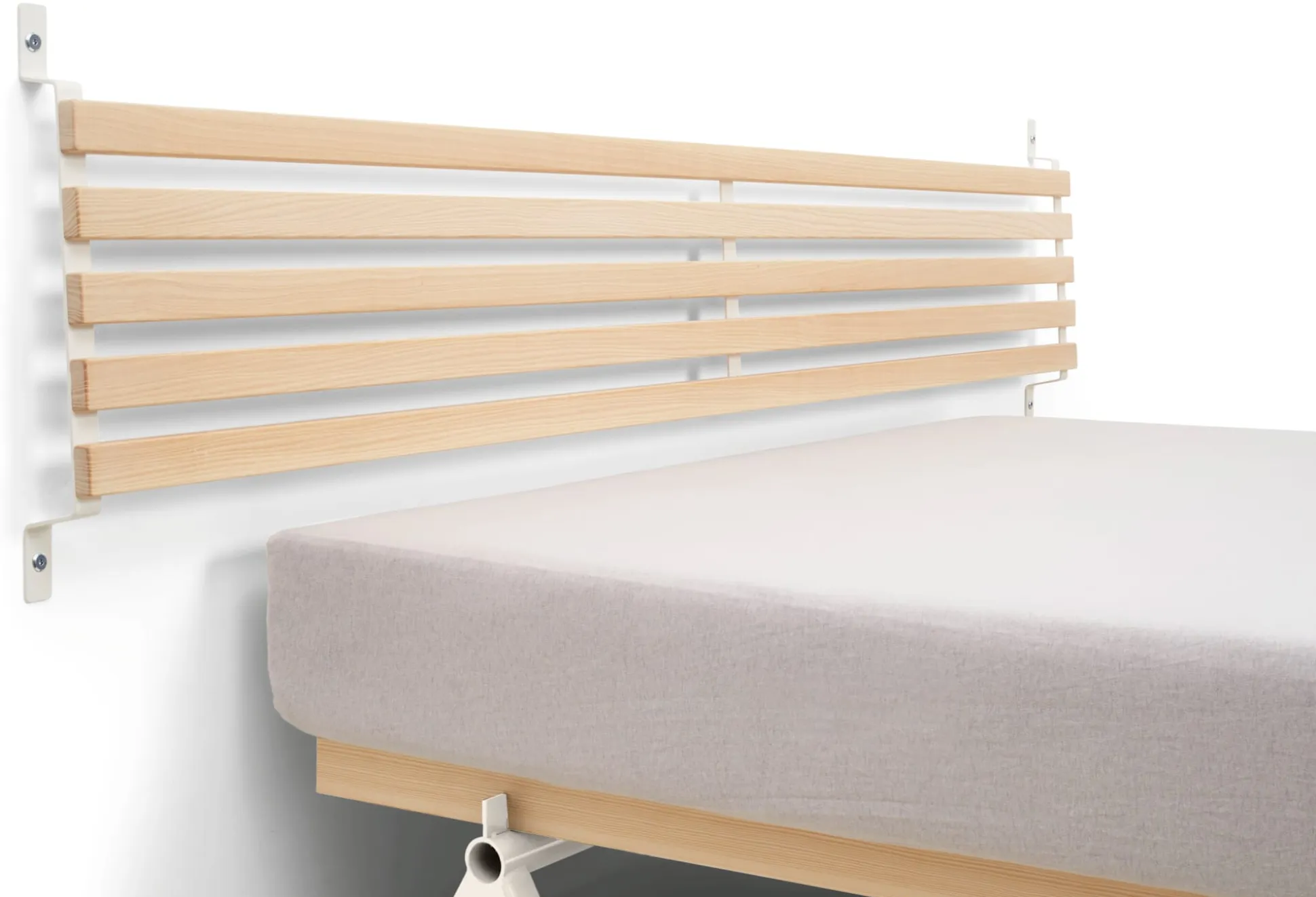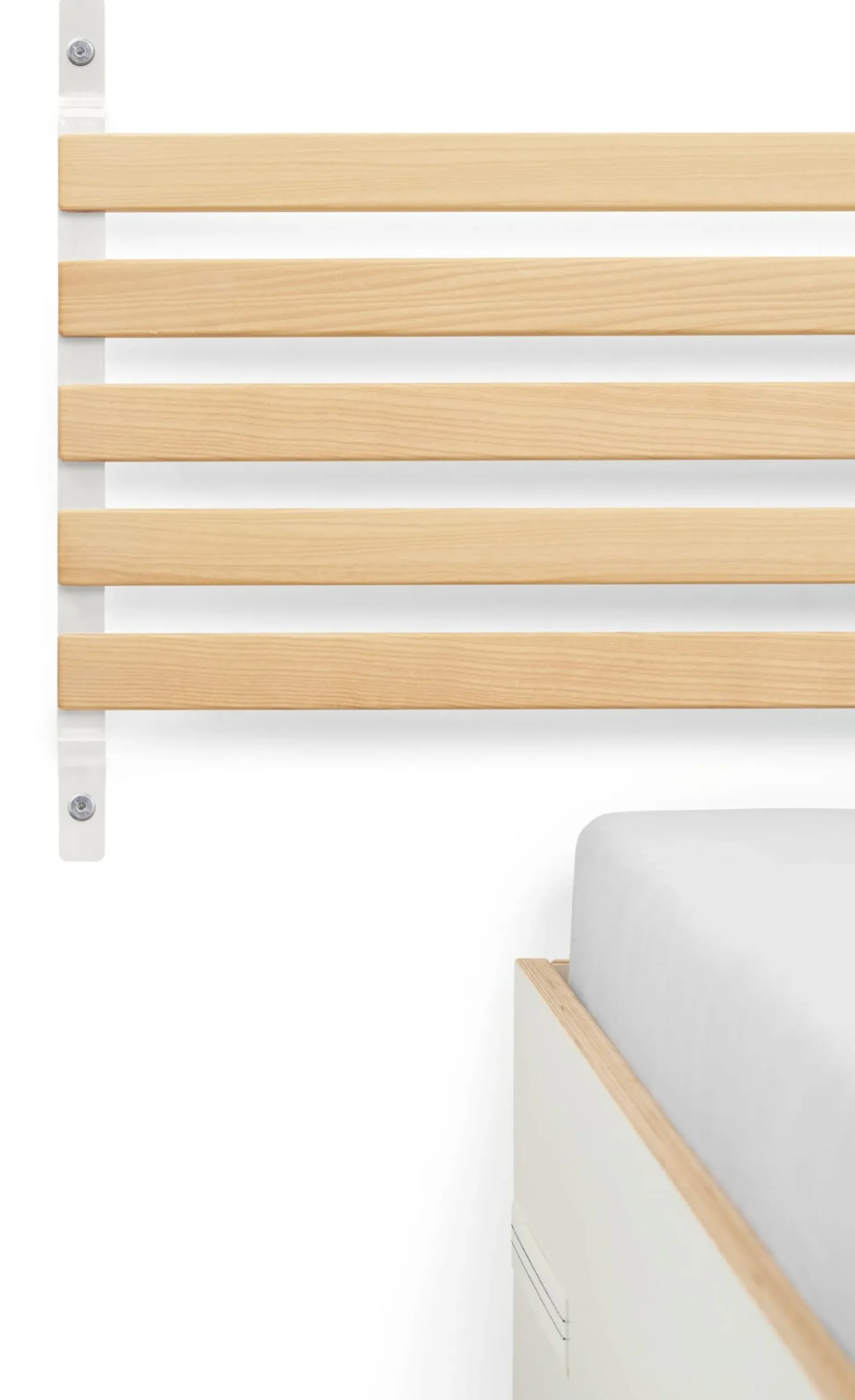SCHMIEGER ist ein universell einsetzbares Kopfteil und Rückenlehne zugleich. Die naturbelassenen und samtweich geschliffenen Leisten aus Eschenholz sind flexibel und geben bei Belastung leicht federnd nach. Sie reagieren beim Anlehnen auf Körperdruck und bieten angenehmen Komfort. Kissen bieten sie Halt, Decken lassen sich darüber hängen. In seiner schlichten Formgebung passt sich SCHMIEGER diskret an und ergänzt Betten und Liegen verschiedenster Art. Hier in der schmaleren Variante mit einer Breite von 165 cm. Als Kopfteil ist es für Betten bis zu einer Breite von 160 cm gedacht, denn ein seitlicher Überstand ist Teil der Gestaltungsidee. Die Montage über die beiden an der Wand zu montierenden Metallbügel ist denkbar einfach, Schrauben und Dübel gehören zum Lieferumfang.