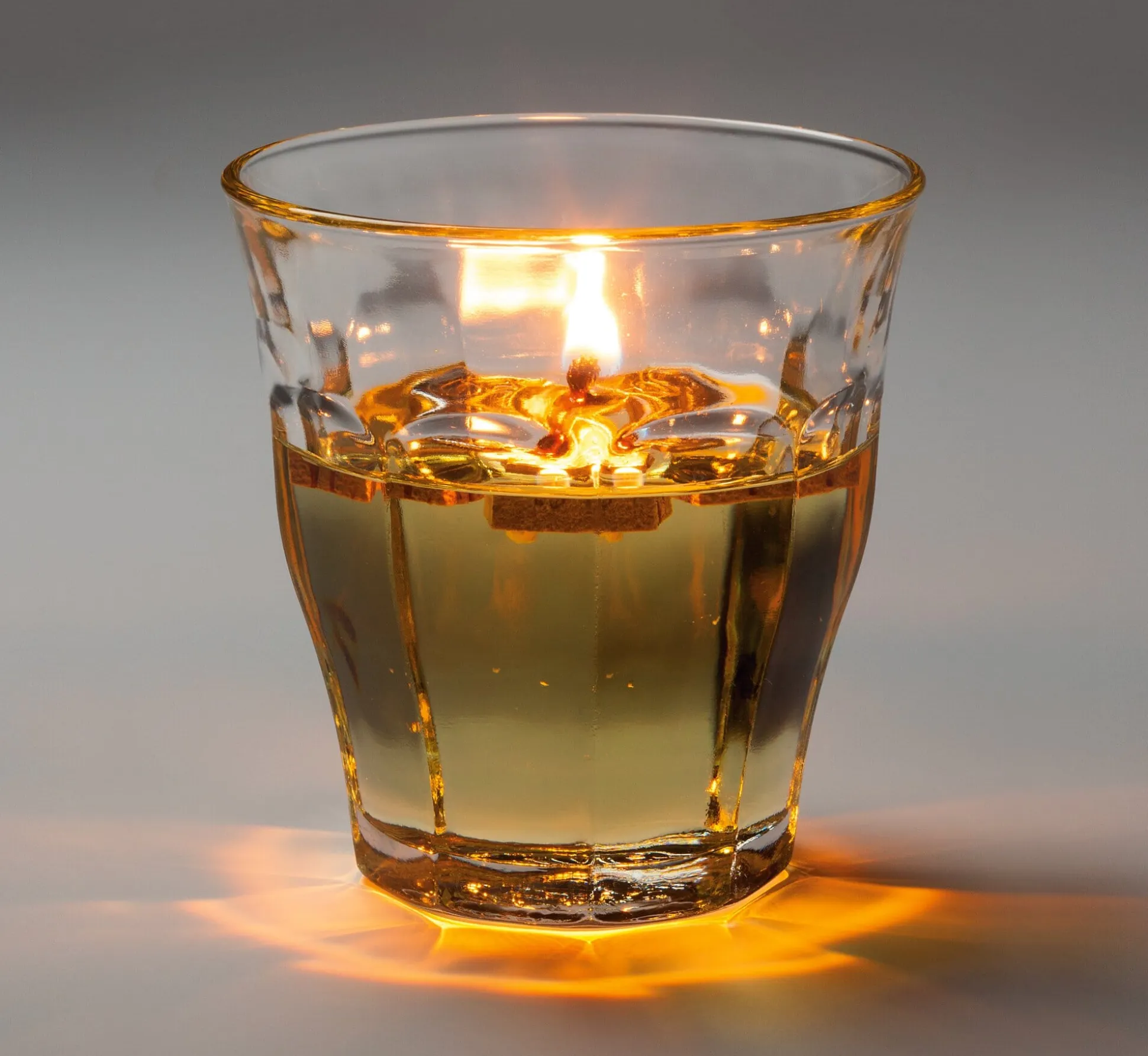 Licht ist elementar: Schon die Schöpfung beginnt mit den Worten „Es werde Licht“, und das Zähmen des Feuers gilt als früheste Kulturleistung der Menschheit. Eine der ältesten künstlichen Lichtquellen ist das Öllicht, das sich nicht nur dank seines angenehmen Lichts bis in die Gegenwart erhalten hat. Populär ist es vor allem auch deshalb, weil es sich einfach – quasi mit Bordmitteln – herstellen lässt. Ein geeignetes Gefäß für das Öl findet sich in vielfältiger Form im häuslichen Bestand, denn letztlich eignet sich dafür jedes kleinere hitzebeständige Glas, das zudem nach dem Einsatz als Lichtgefäß (und anschließendem Abwasch) wieder seinem ursprünglichen Zweck in der Küche dienen kann. Ebenso vorhanden ist der Brennstoff in Form von Pflanzenöl. Dieses ist – anders als petroleumbasierte Lampenöle – nicht nur preiswert und ungiftig, es ist auch in der Handhabung denkbar ungefährlich, da es ohne zusätzlichen Docht nicht brennt. Selbst wenn also ein damit befeuertes Öllicht einmal umgestoßen wird, richtet es (abgesehen von einem Fettfleck) keinen Schaden an.