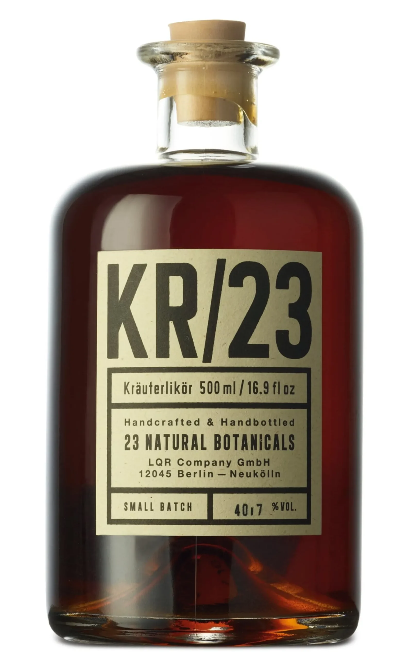 Aus Berlin-Neukölln kommt dieser Kräuterlikör. Er verdankt seinen Namen den 23 natürlichen Kräutern und Gewürzen, die bei seiner Herstellung frisch oder im getrockneten Rohzustand verarbeitet werden – darunter Schwarzer Pfeffer, Nelken, Zimt, Ingwer, Salbei, Orangenschale, Anis, Kardamom, Minze und Muskat. Die alkoholische Basis ist ein aus Getreide gebrannter Wodka von hohem Reinheitsgrad. Das Mazerat reift über mehrere Wochen und wird anschließend in einem zweifachen Filtervorgang abgefüllt. In der Nase entwickelt der KR/23 vor allem Aromen von Zimt und Kardamom. Sie setzen sich, umhüllt von der unaufdringlichen Süße von Kandiszucker und Krustenkaramell, im Mund fort und werden dort von Kamillenblüte und Orangenschale trefflich ergänzt.