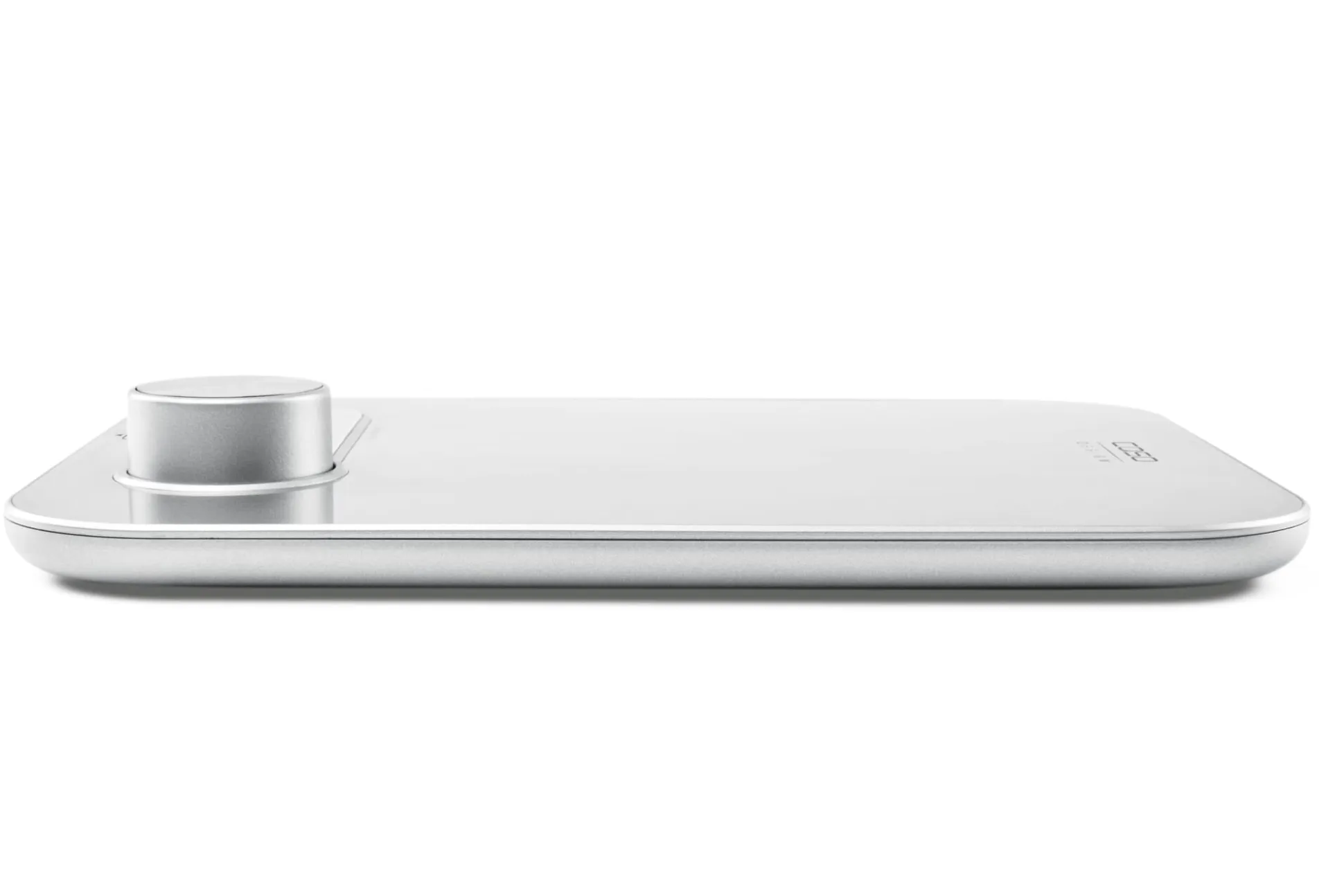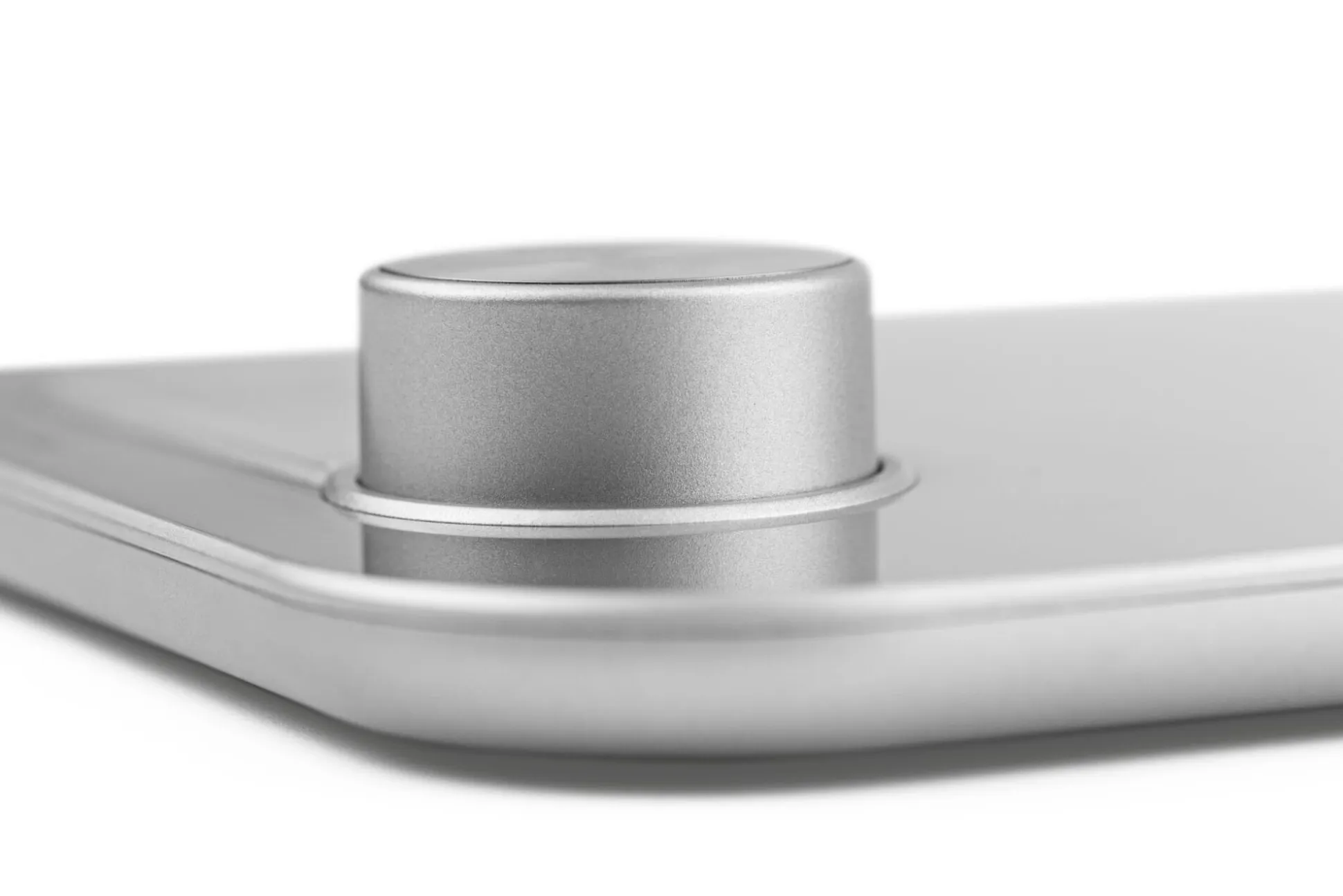 Digital-analog arbeitet die Küchenwaage FRIKTION. Analog betätigt man den Antrieb über den Drehknopf, der die kinetische Energie in elektrische Energie umwandelt und somit die Funktion der Waage mit ihrer digitalen Anzeige sicherstellt. Auf dieser befindet sich auch eine Kontrollanzeige der erzeugten Energie. Die Waage arbeitet dann 1 Minute ohne den Einsatz von Batterien. Die Wiegeskala reicht bis maximal 5 Kilogramm in Schritten von 1 Gramm. Die Wiegfläche der Waage ist aus gebürstetem Edelstahl gefertigt. Der kleine separate Knopf ist für die Tara-Funktion.