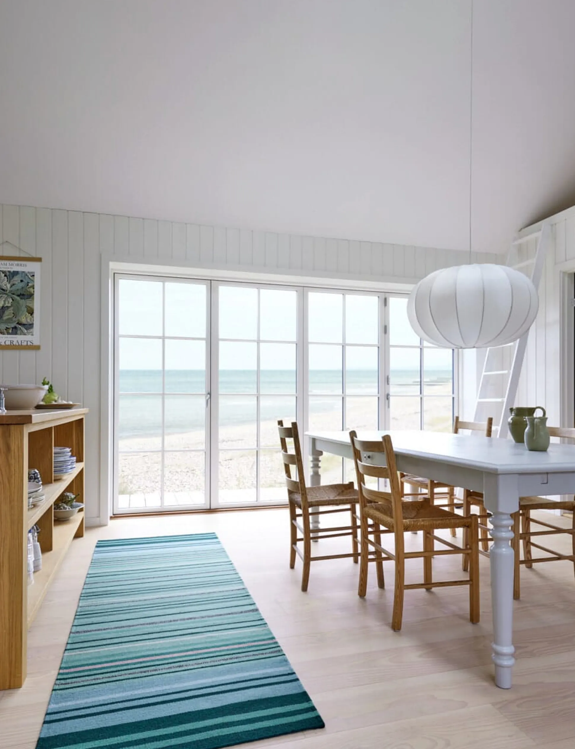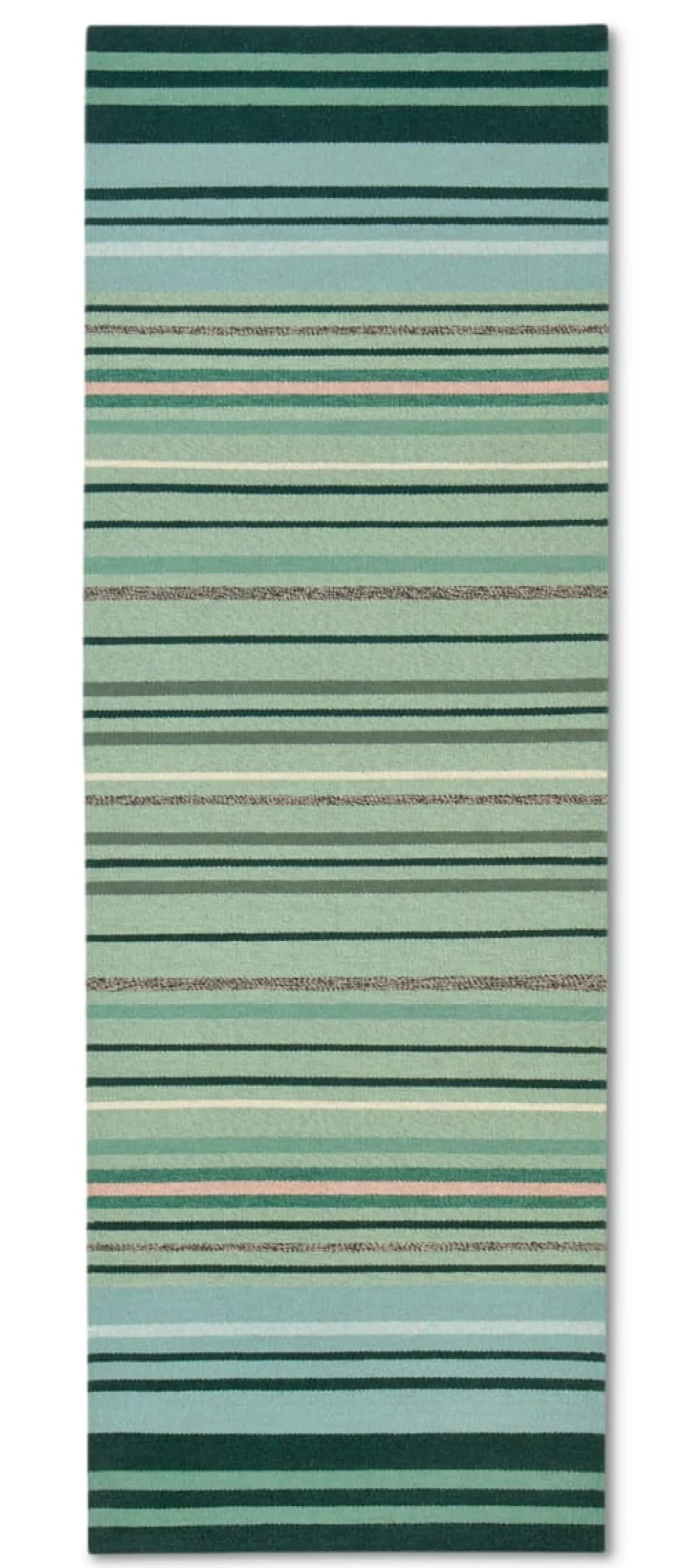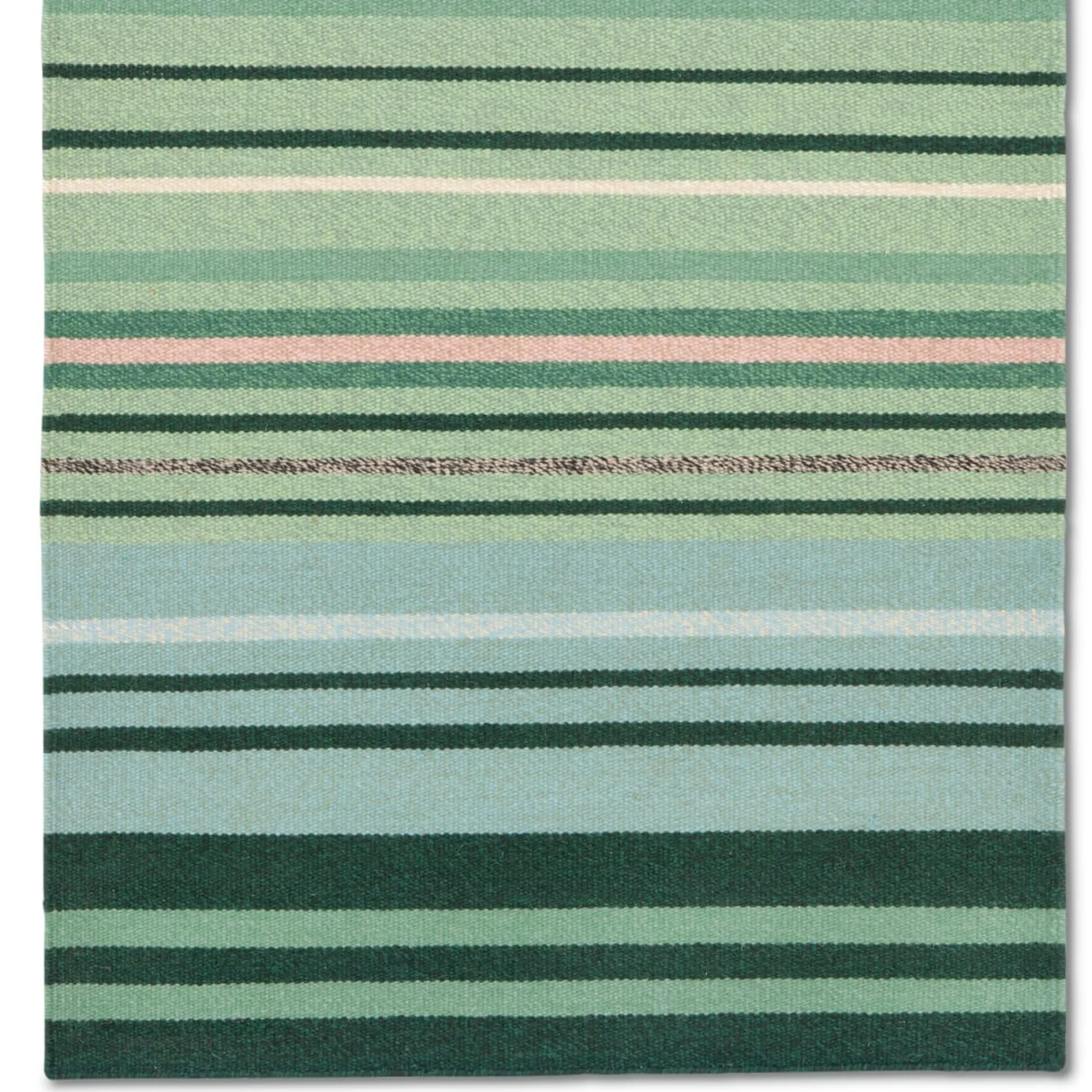 Der handgefertigte, flach gewebte Teppich GILLELEJE reiht Streifen in verschiedenen Grüntönen aneinander. Das gleichmäßig gewebte Material strahlt Ruhe und Frische aus. Bei der feingerippten Oberfläche bilden Kett- und Schussfaden eine leicht erhabene Struktur, die sich einfach reinigen lässt. Einsatz findet GILLELEJE als Läufer im Flur, Teppich vor dem Sofa oder auch in Bad oder Schlafraum.