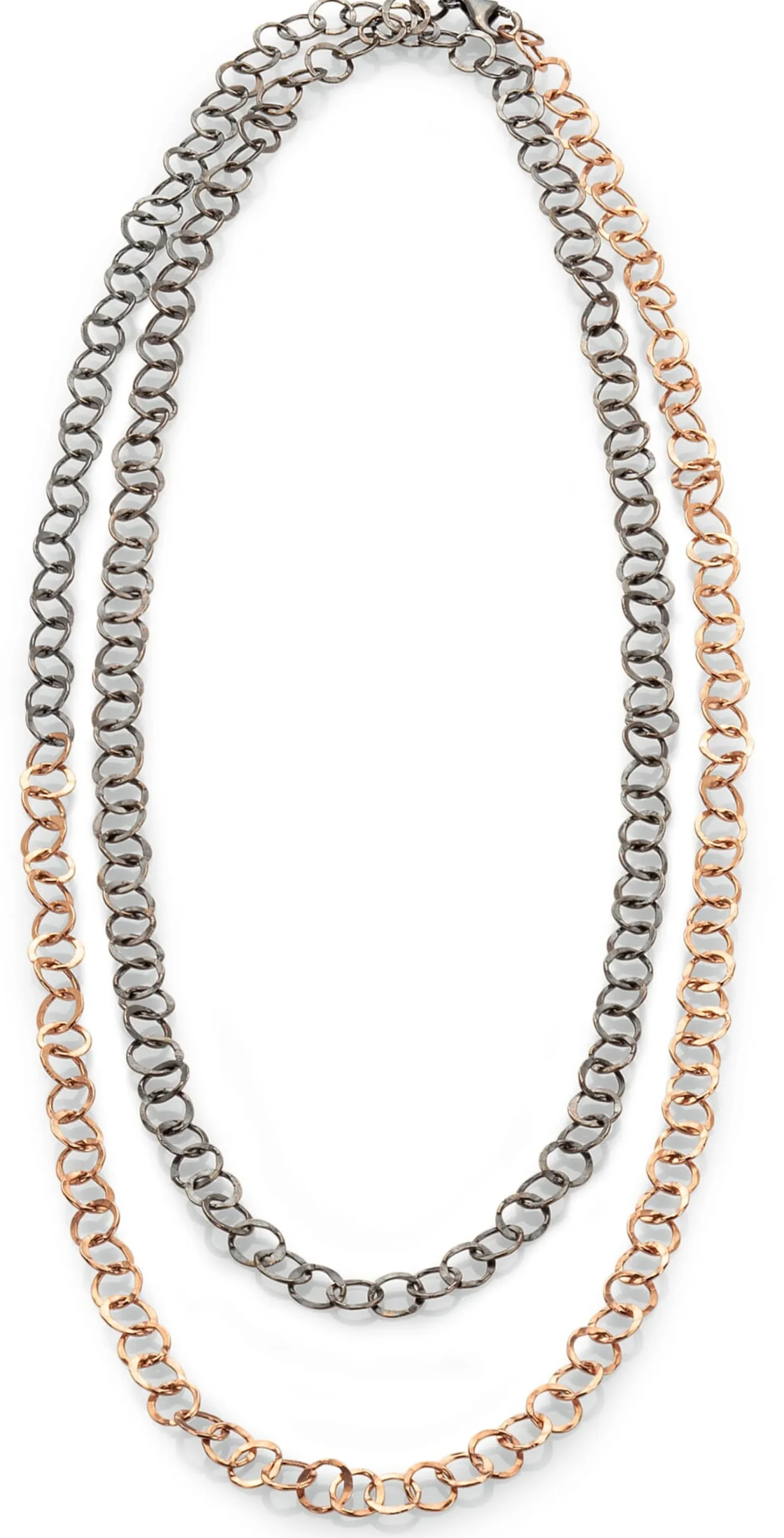 Die einzelnen Glieder dieser 100 cm langen Kette werden aus gehämmertem 925er-Silberblech mit ansprechend strukturierter Oberfläche gestanzt. Das Hämmern hat dabei nicht nur ästhetische Gründe. Vielmehr nutzt Guthmann die physikalischen Eigenschaften des Metalls. Während etwa hartes Eisen durch Schmieden weich wird, wird das von Natur aus weiche und formbare Silber durch das Schmieden hart und stabil. Gleichzeitig bleibt die Kette so angenehm leicht. Nach dem Verhältnis des goldenen Schnitts, das als besonders ästhetisch und harmonisch wahrgenommen wird, werden genau 38 cm der Kette mit Roségold plattiert, der Rest wird dunkel oxidiert. Damit ist das Verhältnis des oxidierten Teils zum roségoldplattierten Teil gleich dem Verhältnis der gesamten Kette zum oxidierten Teil. Ganz gleich ob Sie die Kette einfach oder doppelt gelegt um dem Hals tragen, es entsteht dabei immer ein harmonisches Gesamtbild aus Roségold und dunklem Silber.