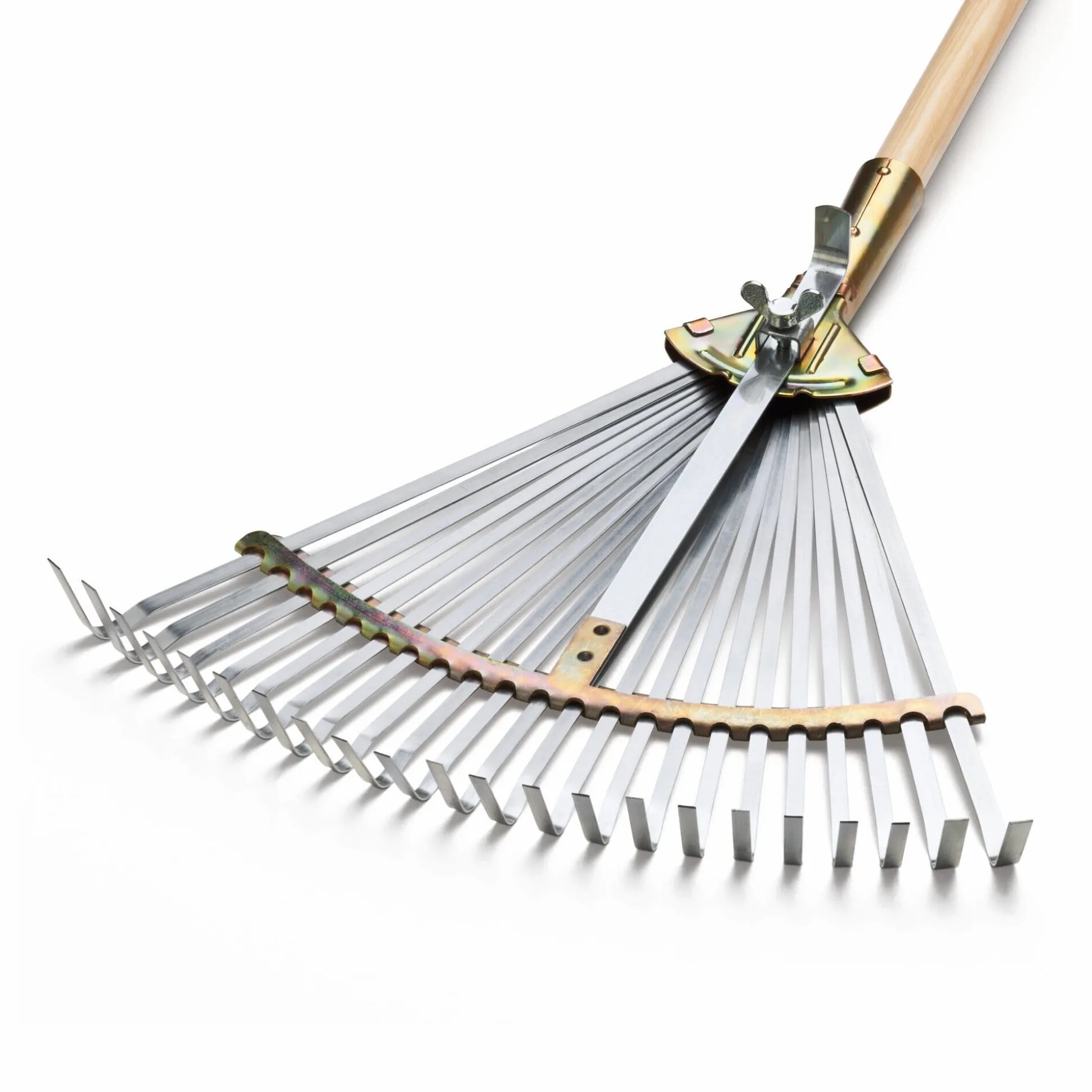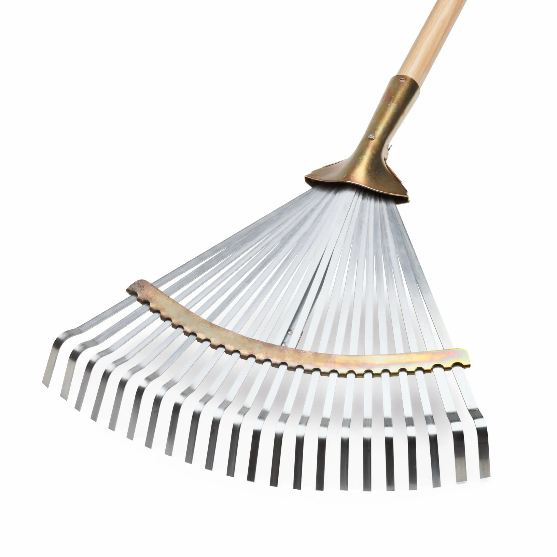Aus dem Sauerland: ein Profi-Stahllaubbesen in besonders stabiler Ausführung, denn die Stielhalterung sowie je zwei Außenzinken und der Bügel sind verstärkt. Die Arbeitsbreite ist von 31 bis 44 cm verstellbar.