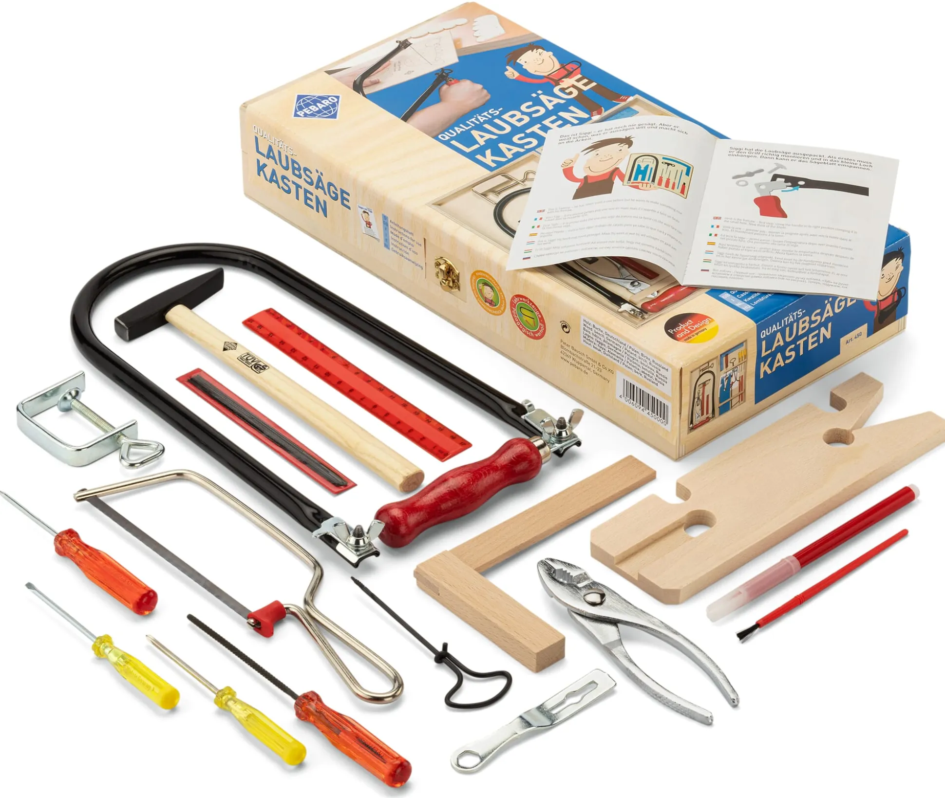 23-teiliges Werkzeug-Set, bestehend aus: 1 Laubsäge (Bügel L 31 × B 15,5 cm), 6 Laubsägeblätter, 1 Laubsägeschlüssel, 1 Brettchen mit Einspannhalterung, 1 Zwinge sowie 1 zusätzliche Säge (Blattlänge 15 cm), 1 Winkel, 1 Ahle, 1 Rundfeile, 1 Stahlzange, 1 Hammer, 1 Kreuz- und 1 Schlitzschraubendreher, 1 Nagelbohrer, 1 Lineal, 1 Stift und 1 Pinsel in einer Holzkiste (L 36,5 × B 18 × H 6,5 cm). Gesamtgewicht 1,35 kg.