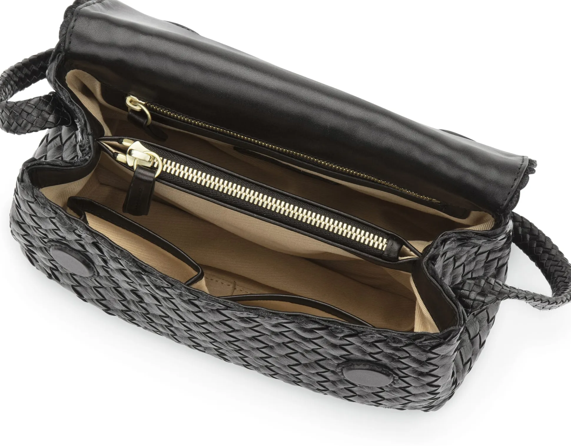 Minimalistisch veranlagte Menschen wissen eine kleinere Handtasche zu schätzen, um die essenziellen Dinge des Lebens stets bei sich zu haben. Umso schöner, wenn sich Funktionalität und Stil zu einem so bemerkenswerten Utensil vereinen wie in dieser Lederhandtasche von Allan K. Die zwei Millimeter starken, zugleich geschmeidigen Büffellederstreifen, von kundiger Hand durchgehend geflochten, ergeben eine tiefschwarze Oberfläche, die je nach Lichteinfall neu zu glänzen weiß. Der flach geflochtene Trageriemen liegt komfortabel auf der Schulter auf, zwei verdeckt gearbeitete Magnetdruckknöpfe unter dem Überschlag halten die Handtasche geschlossen. Mit einem hellbraunen, durablen Baumwollköper gefüttert, überzeugt das Tascheninnere bereits durch sein patentes Fassungsvermögen, das dem gut zehn Zentimeter tief angelegten Taschenboden zu verdanken ist. Möchten Sie sich zwischendurch die Nase pudern, Nachrichten auf dem Handy prüfen oder mit stolzer Geheimagent*innen-Geste den USB-Stick hervorholen, ermöglicht Ihnen der tiefe Boden, die Tasche standsicher abzustellen, damit Sie beide Hände freihaben, während sich Ihnen übersichtlich das Innenleben offenbart. Dort findet sich neben zwei Steckfächern an der vorderseitigen Innenwand und einem rückseitig eingelassenen Reißverschlussfach ein weiteres, mittig eingearbeitetes Reißverschlussfach, so perfekt proportioniert, dass es Ihnen die zusätzliche Karten- und Geldbörse ersetzen kann (wenn Sie möchten).