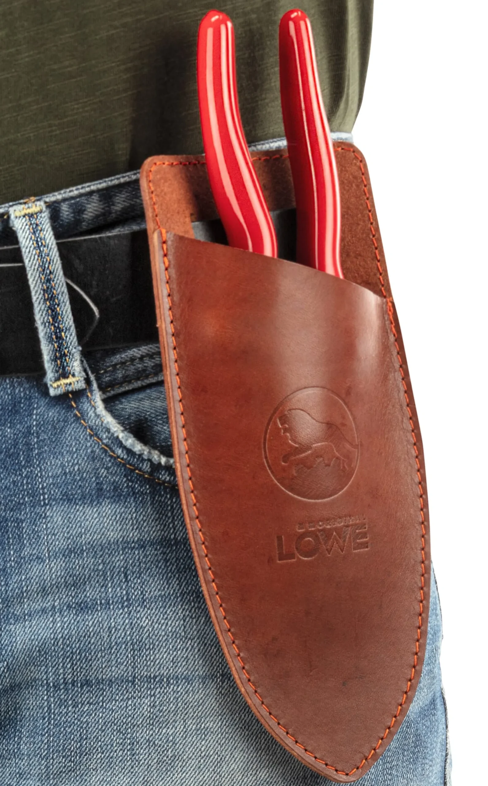 Wenn zwei renommierte Unternehmen sich zusammentun, kommt garantiert ein gutes Ding dabei heraus. Just wie in diesem Fall: Von niemand Geringerem als von Philipp Bree stammt das Design für dieses Lederholster, das der Scherenhersteller Gebr. Schröder GmbH – auch bekannt als Erfinder der originalen Löwe Ambossschere – für seine Scherenmodelle anfertigen lässt. Entsprechend hochwertig fallen Material und Verarbeitung aus: Die Wahl fiel auf ein in Deutschland vegetabil gegerbtes Vollrindleder. Sämtliche weiteren Verarbeitungsschritte erfolgen ebenfalls in Deutschland. So sorgsam verpackt, bleibt Ihre Löwe-Schere zuverlässig vor Beschädigung der Klingen geschützt. (Gleiches gilt selbstverständlich auch für die Taschen Ihrer Arbeitshose oder -jacke, wenn Sie das Holster nicht am Gürtel befestigen möchten.)