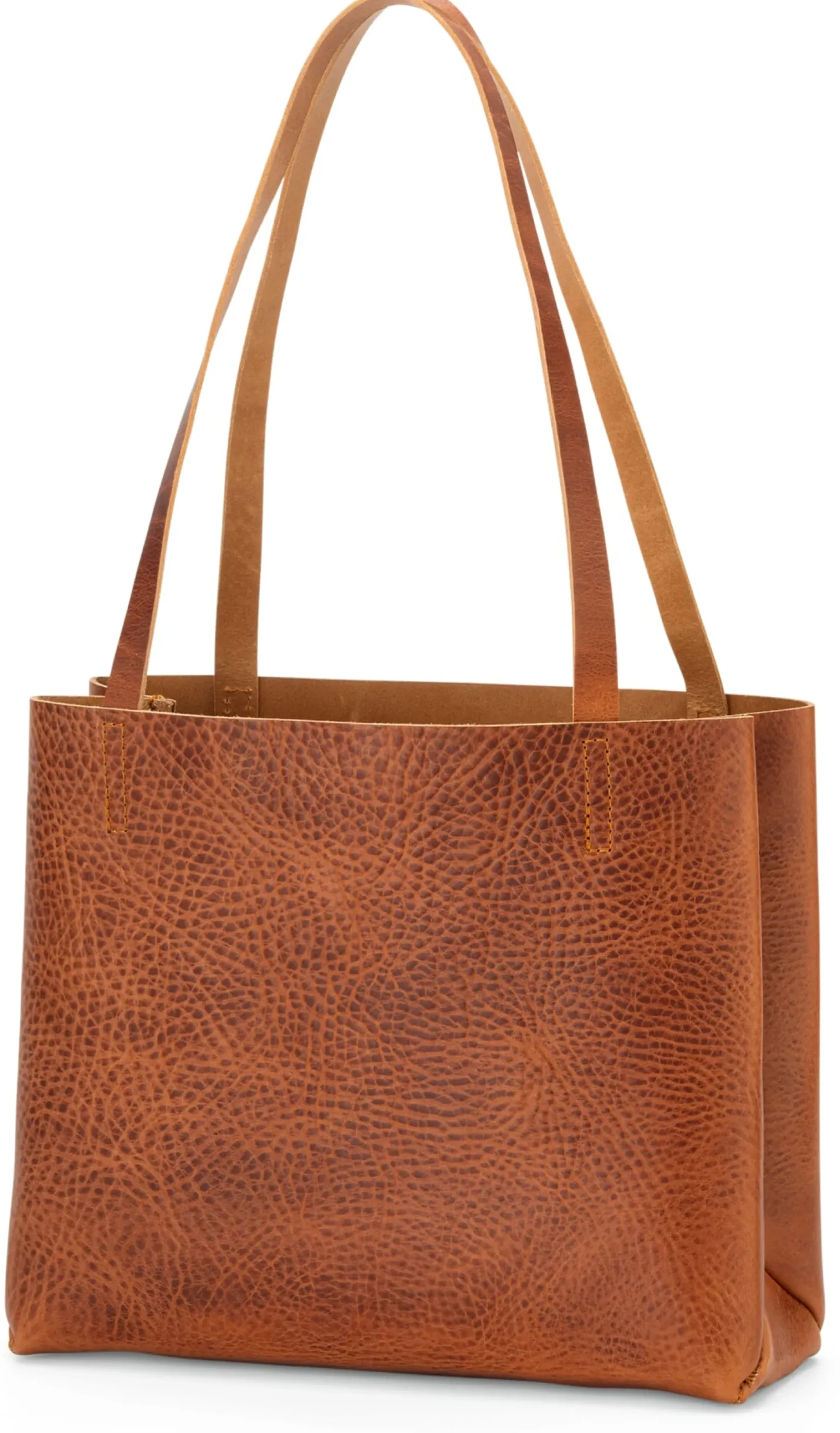 Überaus bemerkenswert ist das Material: 2,5 Millimeter stark, bietet das offenkantig verarbeitete Sattlerleder eine feste Kompaktheit, die sich im Laufe der Zeit zunehmend Ihren Tragegewohnheiten anschmiegen wird. Ein schönes und vor allem ehrliches Detail offenbart sich in dem naturbelassenen Narben: Er steht zu seinen kleinen Fehlern, denn er wird nicht weiter zugerichtet und bleibt vollständig offenporig. So zeigt das vom Rind stammende Leder seine natürliche Struktur, die von Shopper zu Shopper unterschiedlich ausfällt. Und auf ebenso natürliche Weise wird das Leder materialtypisch mit dem Gebrauch eine unverwechselbare Patina annehmen.