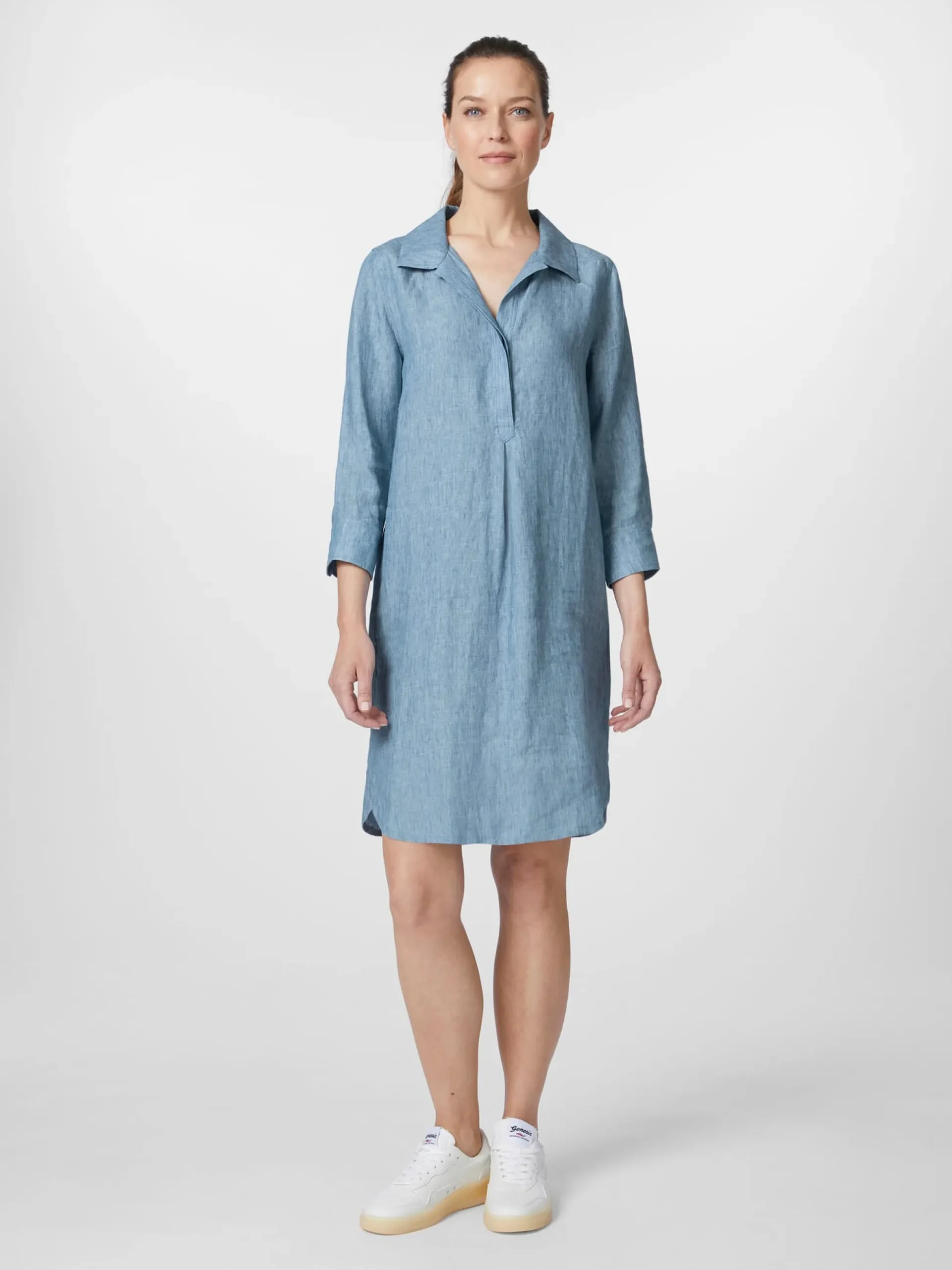Aus belgischem Leinen wird dieses Kleid mit Reverskragen und verdeckter Knopfleiste mit Perlmuttknöpfen konfektioniert. Die Knopfleiste läuft in einer Kellerfalte aus. Unter der Rückenpasse befindet sich ebenfalls eine Kellerfalte. Die Ärmel des gerade geschnittenen Kleides lassen sich aufkrempeln und ebenfalls per Perlmuttknopf knöpfen. Der Saum ist gerundet.