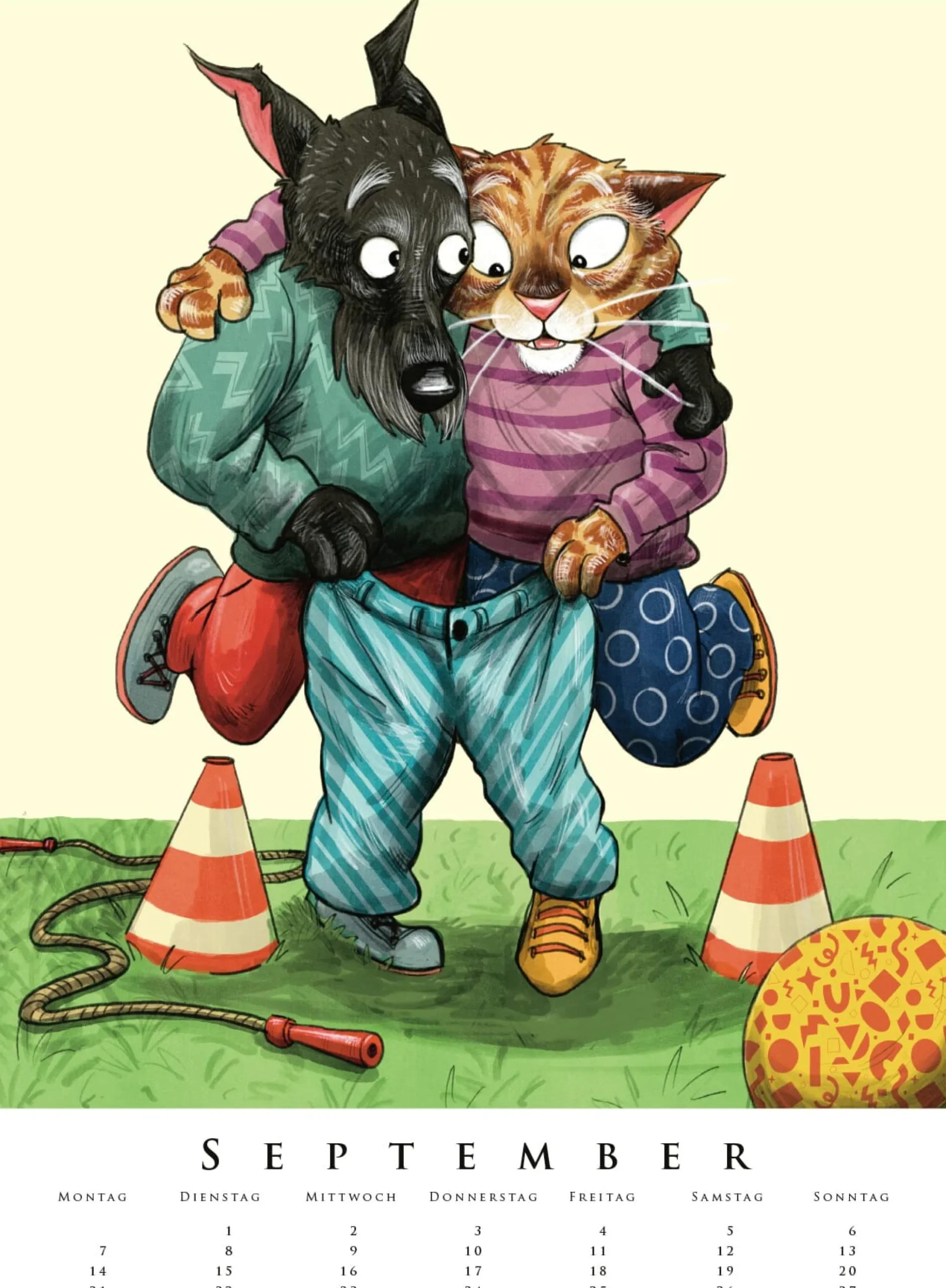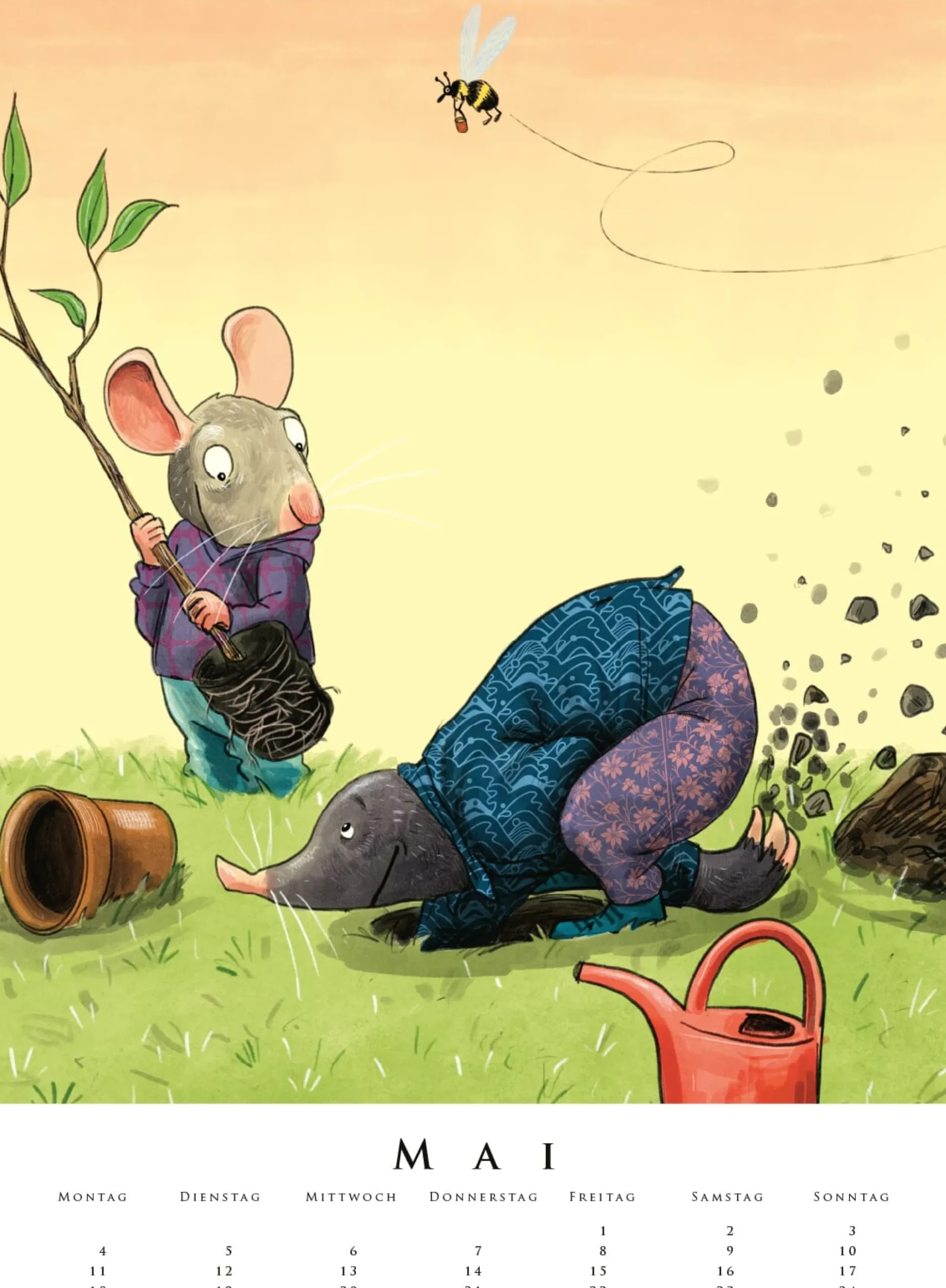 Wie angelt man den Papierdrachen aus der Baumkrone? Und wie reicht man an die Leckereien heran, wenn man klein ist? Ganz einfach: im Team! „Gemeinsame Sache“ ist das Motto des neuen Kinderzimmerkalenders von Leonard Erlbruch. Auf 12 farbenfrohen Monatsblättern erzählt er, wie Schweres leichter wird und Lustiges noch lustiger, wenn man sich zusammentut. Der beliebte Kalender jetzt im neuen Format: 34,6 x 48,2 cm.