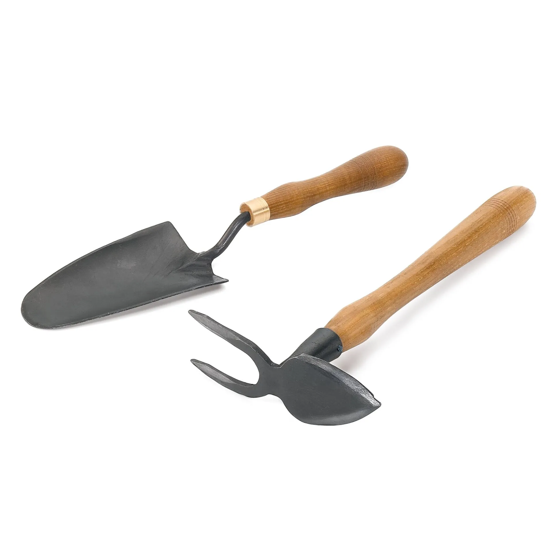 Die Geräteköpfe sind aus geschmiedetem und gewachstem Kohlenstoffstahl, die Griffe aus mit Leinöl behandeltem Eschenholz. Bei der Schaufel werden die Köpfe von einer Messingzwinge gehalten; eine stabile Tülle umschließt den etwas längeren Griff der Hacke. Gartenwerkzeuge wie diese wurden in England bis in die 1930er Jahre noch hergestellt.