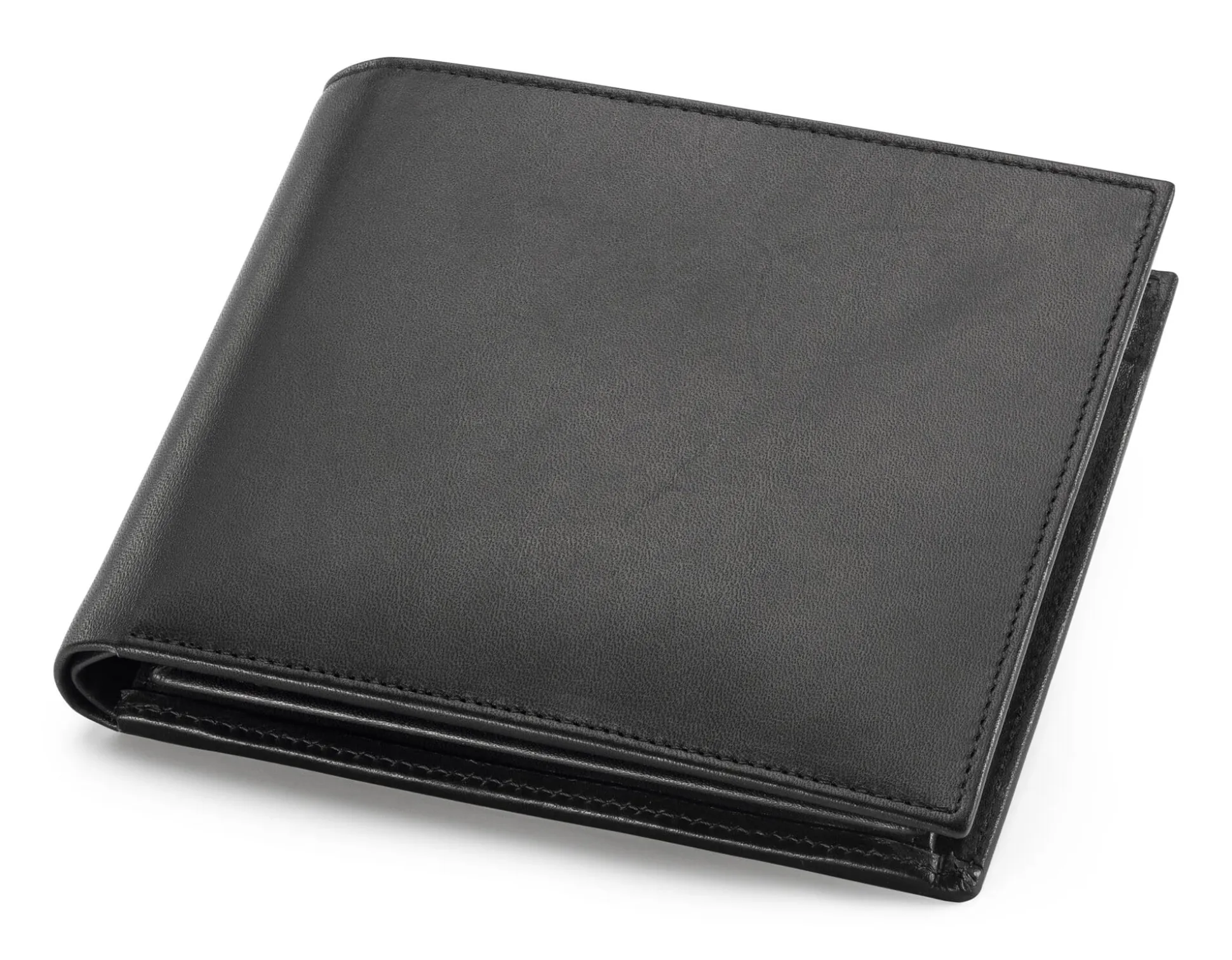 Ein klassisches Herrenportemonnaie mit fünf Kartenfächern, die ein Überschlag – mit drei weiteren Kartenfächern – schützt. Mit zwei Geldscheinfächern und einem langen Fach hinter den Kreditkartenfächern, das zum Beispiel Platz für den Kfz-Schein bietet. Mit Leder ausgeschlagenes Münzfach. Rindleder (Stärke 1,6–1,8 mm), vegetabil gegerbt, Herkunft Deutschland. Hergestellt in Tschechien. Breite 12 cm, Höhe 10 cm. Gewicht 95 g.