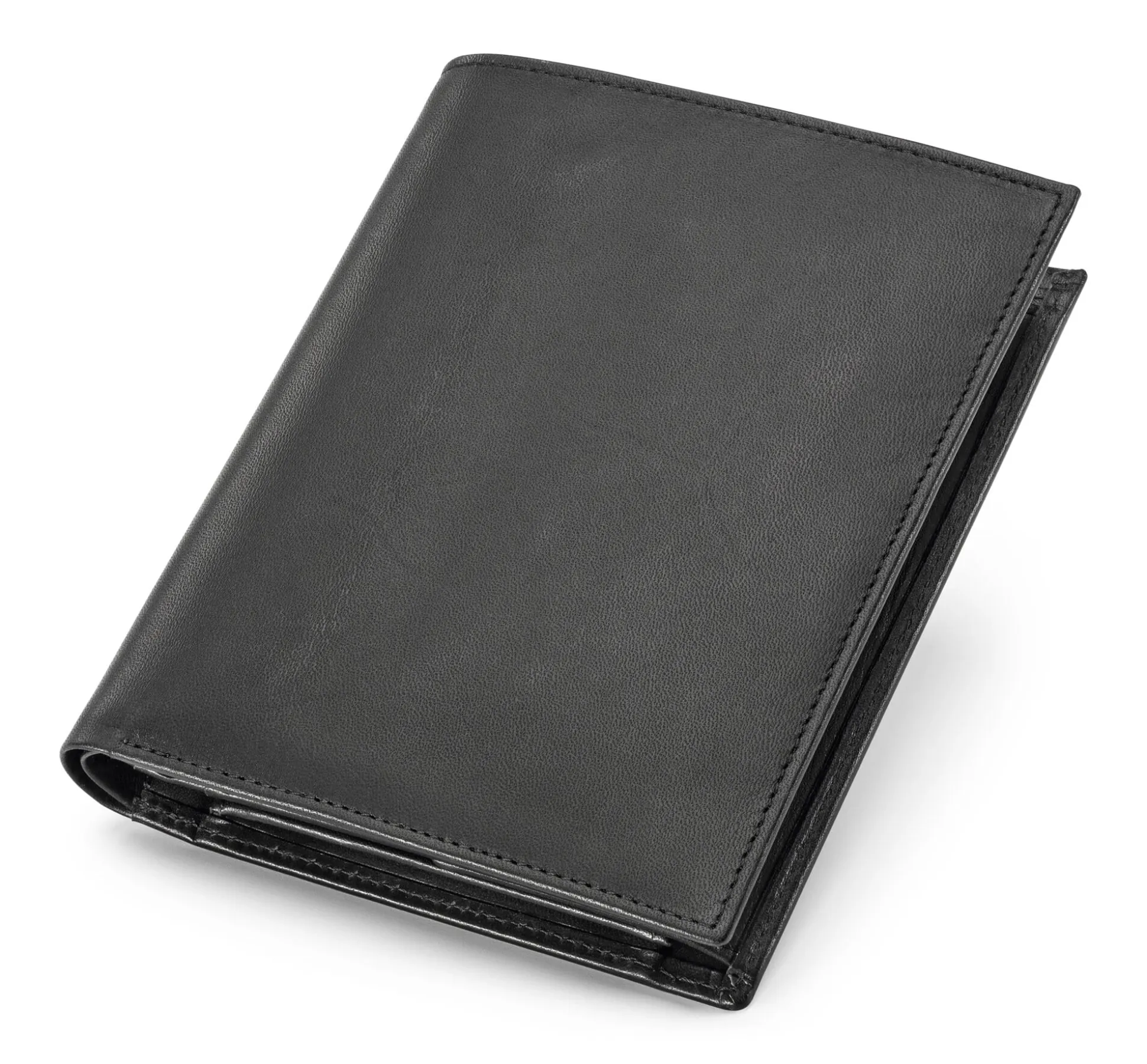 Die hochformatige Kombi-Geldscheinbörse ist mit zwei großen Geldscheinfächern und einem ledergefütterten Fach für Hartgeld ausgestattet. Unter Letzterem befinden sich zwei weitere Fächer für Ausweise. In der Innenklappe lassen sich links sechs Karten mitführen, rechts drei Kreditkarten und zwei Ausweise. Vier Ausweise haben im äußeren Klappenteil Platz, weitere Papiere im großen Extrafach hinter der Innenklappe.