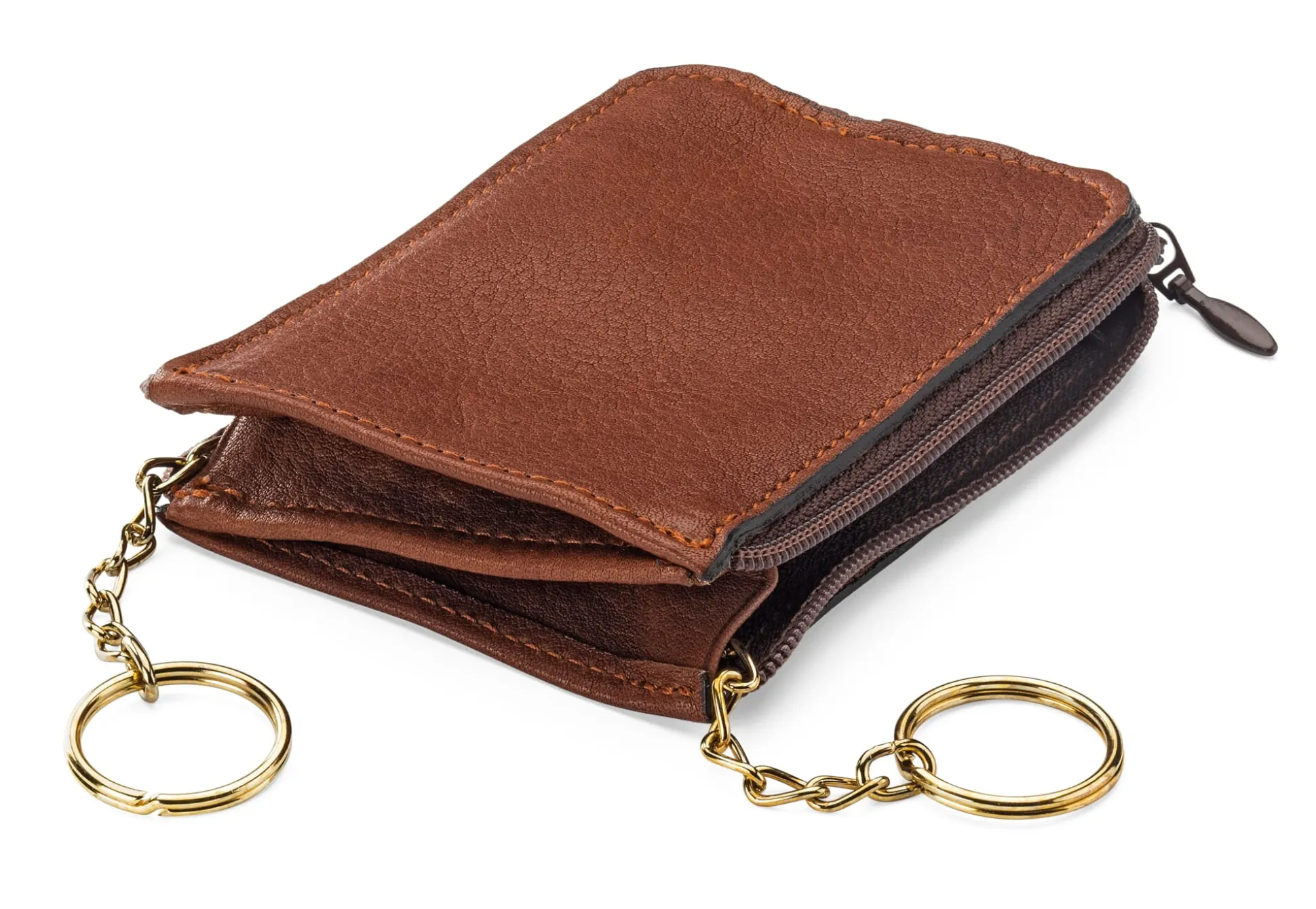 Das Schlüsseletui besteht aus zwei Reißverschlusstaschen, in denen jeweils Schlüssel – oder auch ein paar Münzen und kleingefaltete Scheine – Platz finden. Zwei seitlich eingearbeitete Lederkeile sorgen dafür, dass sich das Etui auch noch mit voluminösem Inhalt schließen lässt. Die beiden Schlüsselringe sind an 7 cm langen Ketten befestigt, die wiederum der Sicherheit halber miteinander vernietet sind.