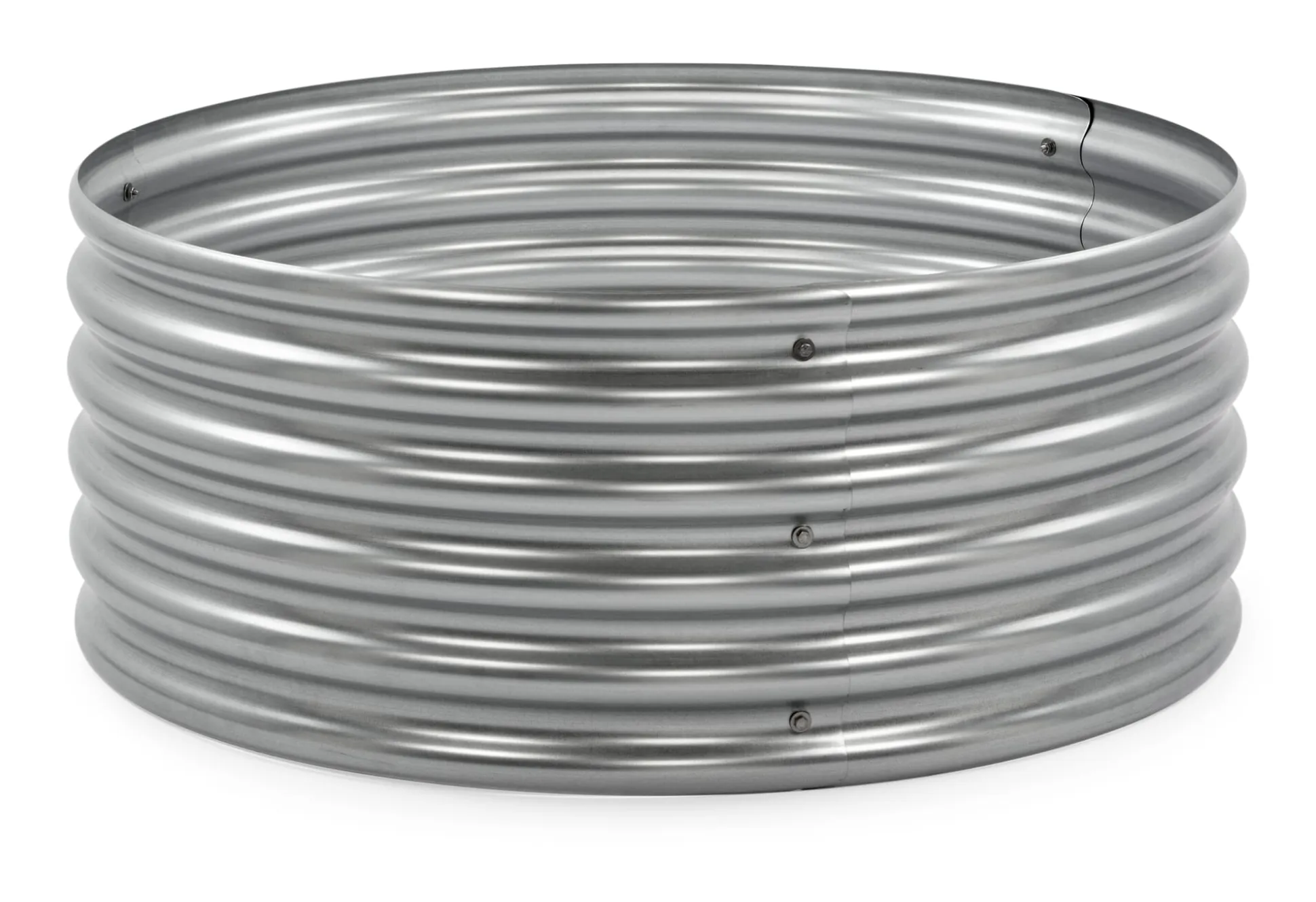 Wellblech, beidseitig feuerverzinkt und bombiert. Bestehend aus drei Einzelsegmenten (Stärke 0,75 mm). Hergestellt in Deutschland. 42 cm hoch, Ø 100 cm. Gewicht ca. 12 kg. Montagematerial und eine Anleitung liegen bei.