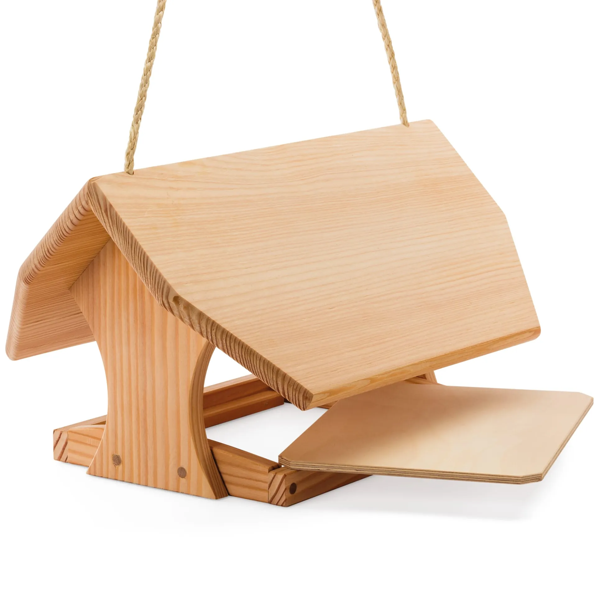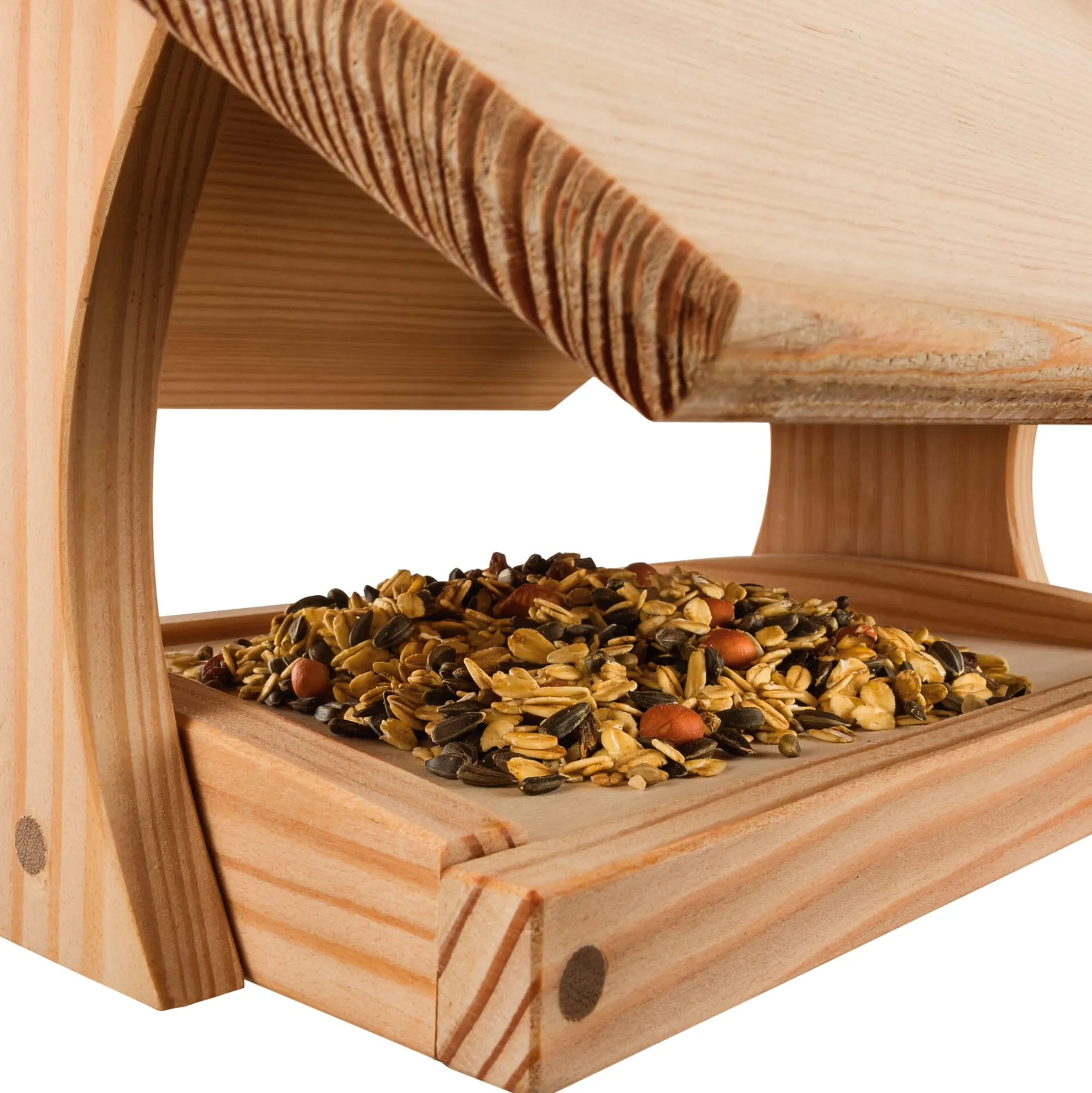 Das tief heruntergezogene Dach bietet nicht nur den Vögeln Schutz vor Wind und Wetter, wenn sie sich in diesem Haus zum Fressen niederlassen – es hält auch das Futter vor der Einwirkung durch Feuchtigkeit fern. Wenn aber doch einmal Regen oder Schnee auf den Boden der Futterstelle gelangen, läuft das Wasser über die vier gekappten Ecken ab. So trocknet die Platte besser ab, und das Vogelfutter bleibt nicht auf nassem Untergrund liegen, schimmelt also nicht. Für eine gründliche Reinigung von Futter- oder Kotresten kann die nur lose auf den innen liegenden Leisten aufliegende Bodenplatte auch komplett herausgenommen werden.