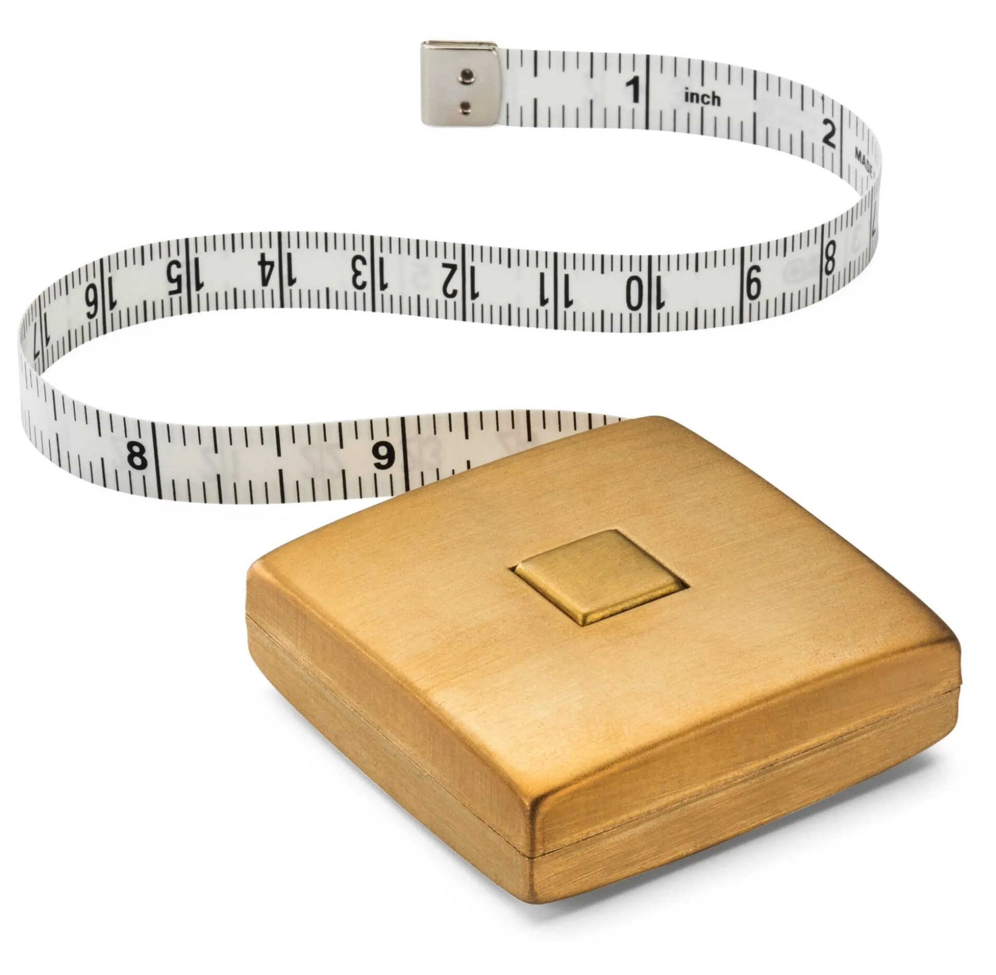 Gehäuse aus gebürstetem Messing, 5 x 5 cm, Gewicht 50 g. Maßband aus Polyester, ummantelt mit PVC und dadurch wasserresistent und unempfindlich. Skala in Zentimeter und Inch, Länge 1,5 m. Mit Einrast- und Einrollmechanik. Hergestellt in Deutschland.