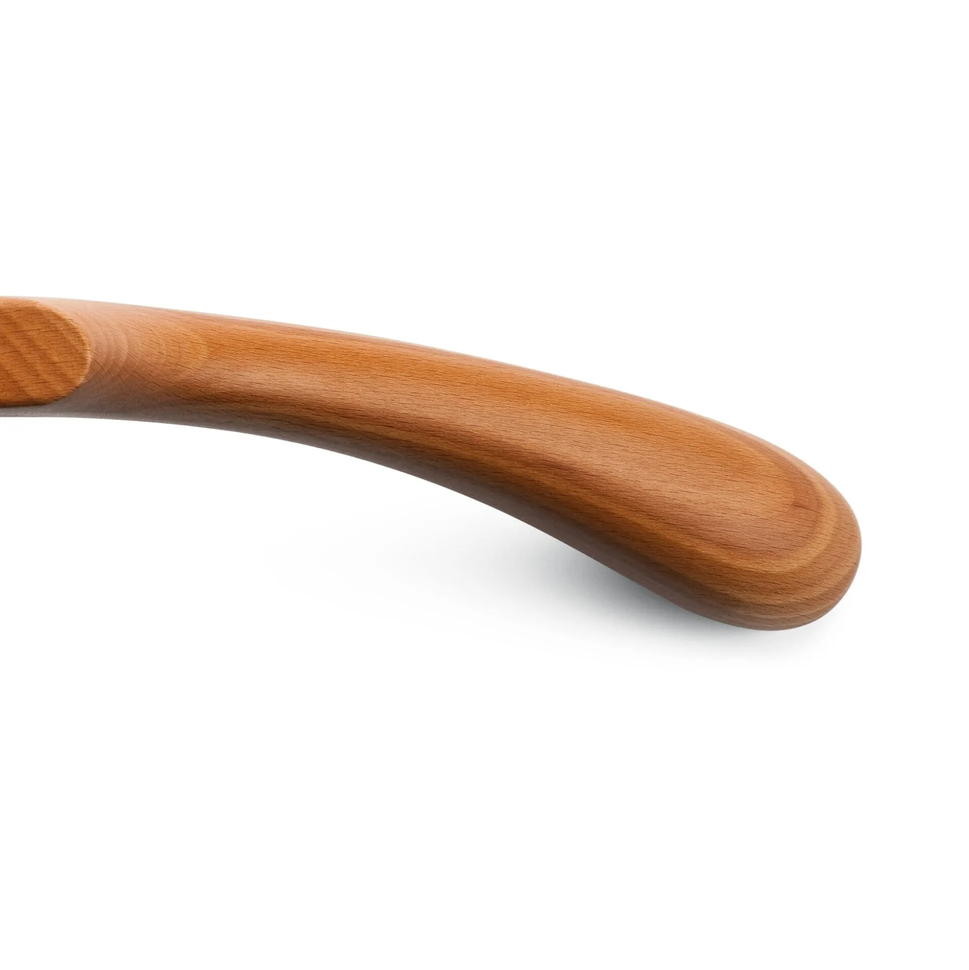 Ein guter Kleiderbügel aus massivem, gedämpftem Buchenholz, mehrfach geschliffen, geglättet und seidenmatt lackiert und mit einem stabilen, vernickelten Haken versehen.
