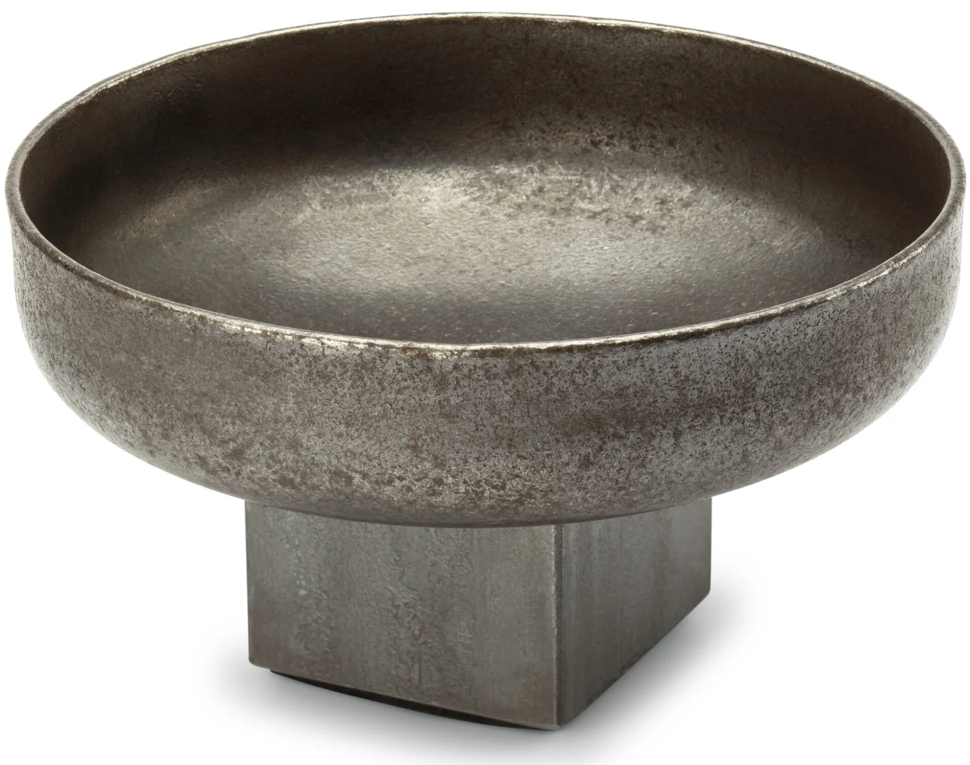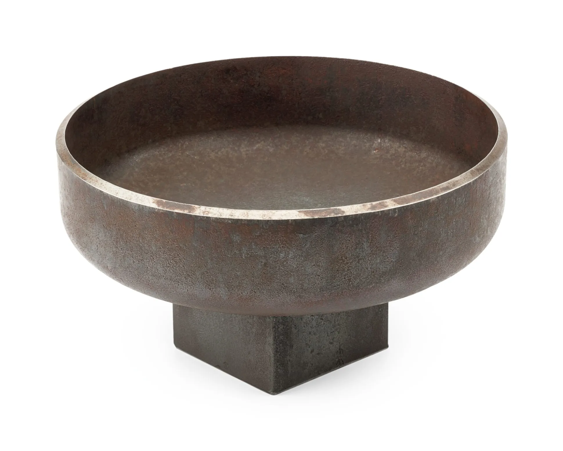 Aus einem Klöpperboden (5 mm Stahl: Werkstoff EN 10025-2, S235JRG2), mit Fuß (nicht angeschmiedet, aus demselben Material, unten mit einer Filzscheibe versehen). Höhe 8,5 cm, Ø 17 cm. Gewicht 1,8 kg. Schale und Fuß sind nicht rostfrei und haben bei Lieferung bereits eine der Bearbeitung entsprechende Patina. Ohne Inhalt.