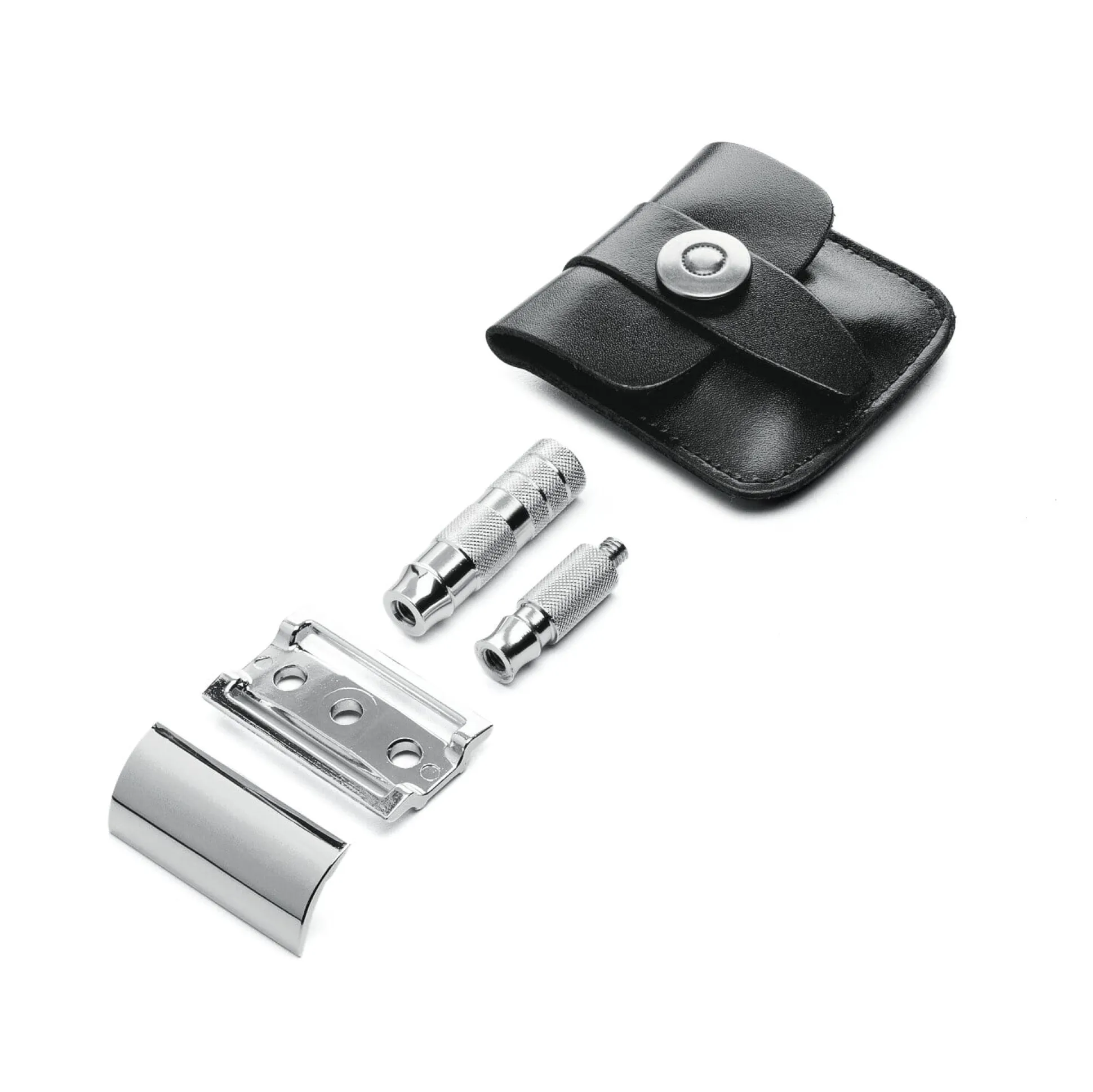 Dieser Reise-Rasierer von Merkur lässt sich in vier Teile zerlegen und in einem kleinen Lederetui (Packmaß 6 × 5,5 × 2,5 cm) verstauen, sodass er auf Reisen kaum Platz benötigt. Dennoch ist diese Ausführung des klassischen, seit 1931 unverändert hergestellten Merkur-Rasierhobels uneingeschränkt gebrauchstüchtig.