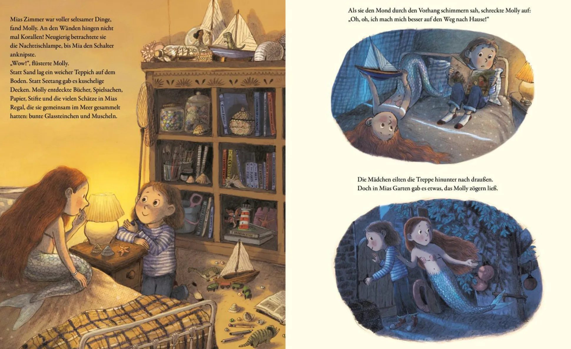 Mia hat, wovon viele träumen: eine echte Meerjungfrau als beste Freundin! Molly lebt nur einen Kieselwurf entfernt in der kleinen Bucht, wo die beiden nach verborgenen Schätzen tauchen oder mit Delfinen schwimmen. Aber Molly war noch nie an Land. Bis zur Nacht des magischen Mondes, in der alle Meeresbewohner wie durch Zauberhand durch die festlich geschmückten Straßen schwimmen können! Wie stolz Mia ist, Molly zum ersten Mal ihr Zuhause zu zeigen und mit ihr hoch in den Himmel zu schaukeln! Doch bevor der Mond das Meer berührt, muss Molly wieder zurück im Meer sein, sonst erlischt die Magie für immer. Als Mia in Not gerät, muss die kleine Meerjungfrau eine Entscheidung treffen … Mit ihrer herzerwärmenden Geschichte und den tollen atmosphärischen Bildern entführt Briony May Smith in eine verzauberte Welt, in die man beim Vorlesen und Zuhören wunderbar abtauchen kann. Mit Mia und Molly erleben Mädchen, Jungen und die ganze Familie ein ebenso emotionales wie magisches Freundschaftsabenteuer, das noch lange nachwirkt.