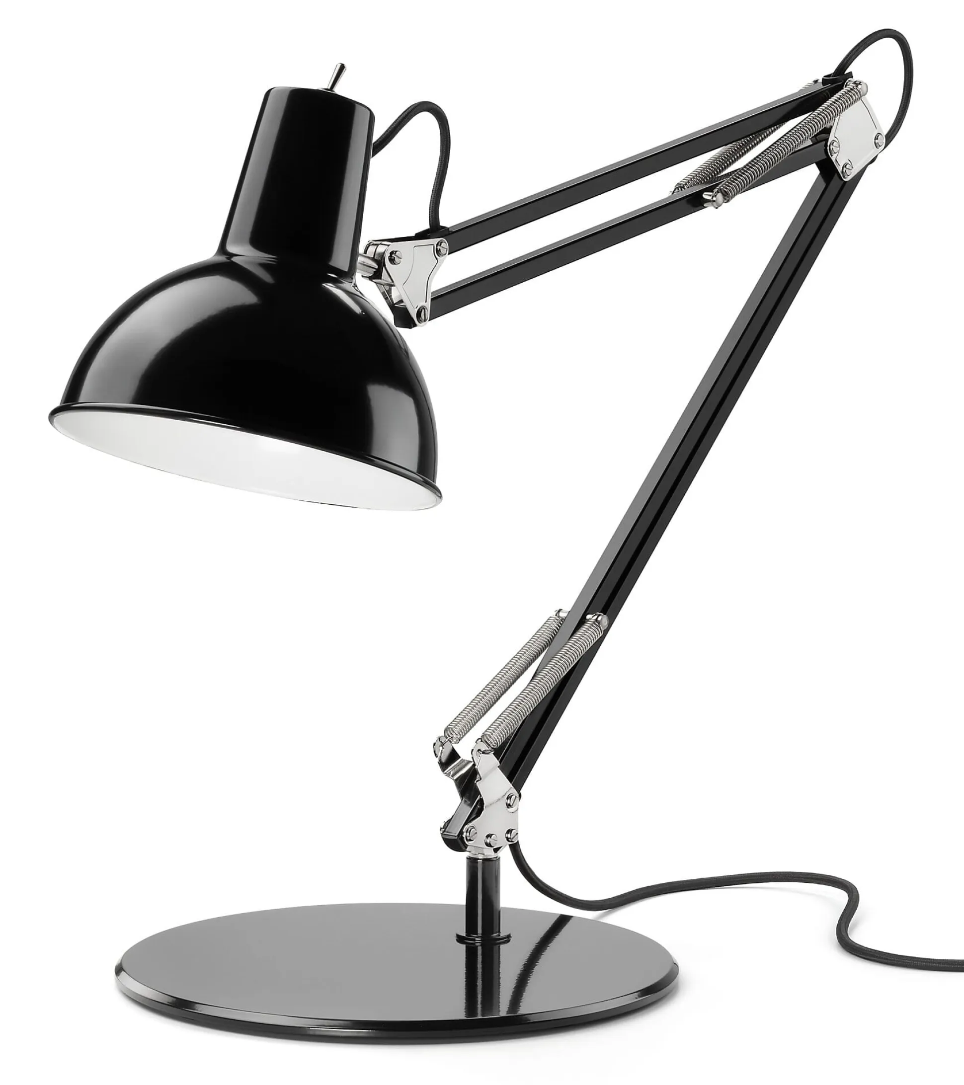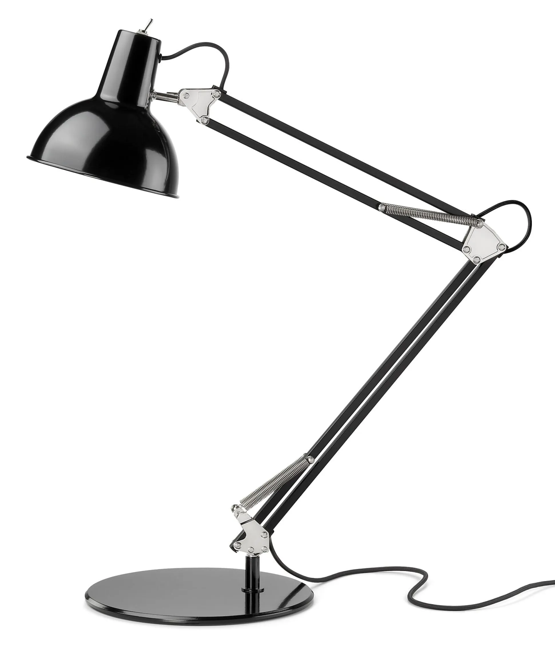 Jetzt gibt es sie wieder. Und nach wie vor ist diese am historischen Original ausgerichtete Version nicht mit den Billignachbauten zu vergleichen, wie ein Blick auf die Details zeigt: starke, nicht ausleiernde Zugfedern, stabile 12-mm-Vierkantstahlrohre, ein Klemmfuß aus Aluminiumdruckguss bzw. ein Standfuß aus Stahl, in denen das Trägergestänge drehbar sitzt und ein ordentlicher Metallkippschalter am Schirm.